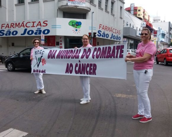 As voluntárias da Rede Feminina de Combate ao Câncer de Joaçaba arregaçaram as mangas literalmente neste sábado. Elas foram as ruas em mais um pedágio, desta vez para alertar a comunidade no Dia Mundial de Combate ao Câncer. Com faixas e panfletos elas chamaram a atenção dos motoristas que circulavam pela área central da cidade.