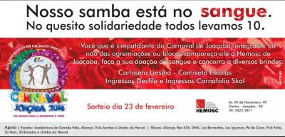 07/01/2014 A Liga Independente das Escolas de Samba de Joaçaba e Herval d´Oeste (LIESJHO) promove a campanha “Nosso samba está no sangue. No quesito solidariedade todos levamos 10”. A campanha elaborada em conjunto com o Hemosc/Joaçaba tem por objetivo auxiliar na captação de doadores para a instituição. Participam da campanha as escolas [Leia Mais]