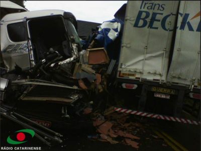 13/08/2013 Um grave acidente na manhã desta terça-feira (13) resultou em uma morte na BR-153 em Irani. O acidente ocorreu por volta das 7h45 no km 35 da rodovia, a cerca de 6km do trevão do Irani sentido ao Paraná, próximo à Celulose. Colisão envolveu três carretas, uma Iveco carregada [Leia Mais]
