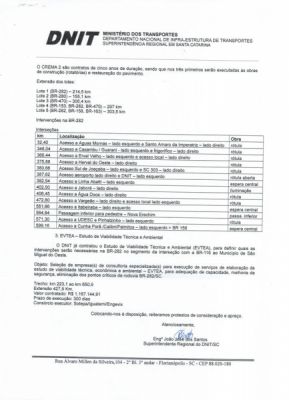 19/07/2013 O Ministério dos Transportes através do Departamento Nacional de Infraestrutura de Transportes (DNIT) firmou contrato de R$ 1.167.144,91 com a empresa Sotepa/Iguatemi/Angevix para elaboração de Estudo de Viabilidade Técnica e Ambiental (EVTA) para definir quais as intervenções serão necessárias na BR-282em Santa Catarina.Oestudo tem por finalidade apontar as necessidades de [Leia Mais]