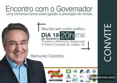 19/02/2013 O governador Raimundo Colombo estará em Joaçaba, nesta terça-feira, 19, para um evento denominado “Encontro com o governador: uma conversa franca sobre gestão e prestação de contas”. A palestra está marcada para as 20 horas, no Teatro Alfredo Sigwalt. De acordo com o secretário de Estado de Assuntos Estratégicos, [Leia Mais]