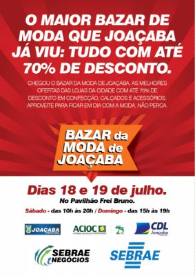13/07/2015 O Sebrae vai realizar no pavilhão Frei Bruno em Joaçaba neste final de semana, dias 18 e 19 deste mês o 1º Bazar da Moda que contará com exposição de produtos de 26 empresas para a venda de confecções, calçados e acessórios, que estarão oferecendo ao público descontos de até [Leia Mais]