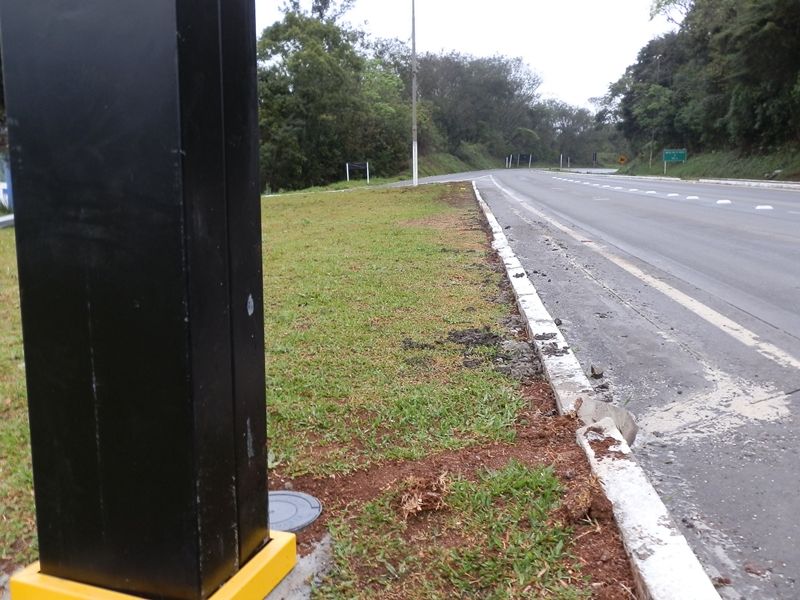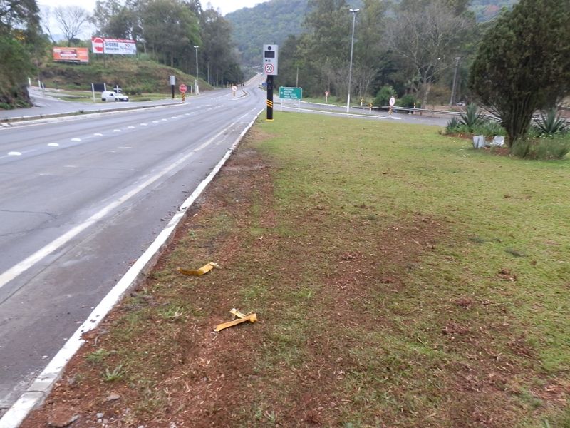 28/08/2012 Uma carreta destruiu um equipamento que captura as imagens de veículos ao cruzar pela lombada eletrônica no trevo de acesso a Joaçaba pela BR-282. O fato aconteceu por volta das 06h30 desta terça-feira (28). Segundo informações, uma carreta que fazia sentido Catanduvas/Erval Velho se perdeu na curva, invadiu o canteiro e derrubou o equipamento, que fica ao lado do controlador de velocidade. A carreta teria feito um “L” na pista. As lombadas eletrônicas foram recém-instaladas nas imediações da ponte Alfredo Ítalo Remor pela empresa Kopp, contratada pelo DNIT para colocação dos aparelhos de controle de velocidade. O motorista da carreta fugiu.