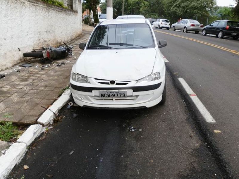 01/11/2012 Um acidente foi registrado por volta das 07h30 desta quinta-feira (01) na rua Tiradentes, próximo à esquina da empresa Hisa/Weg em Joaçaba. Colisão envolveu três veículos, VW/Polo placas MGI-7282 de Joaçaba, GM/Celta placas MCW-8773 de Monte Carlo e motocicleta Yamaha placa MEU-8077 de Joaçaba. Segundo as informações o Polo fazia sentido delegacia de Polícia/Vila Pedrini, e ao efetuar uma manobra para estacionar no sentido contrário, o motociclista fez uma ultrapassagem em alta velocidade colidindo na lateral do carro. Com o choque a moto atingiu o Celta que estava estacionado. A moto foi parar na calçada.