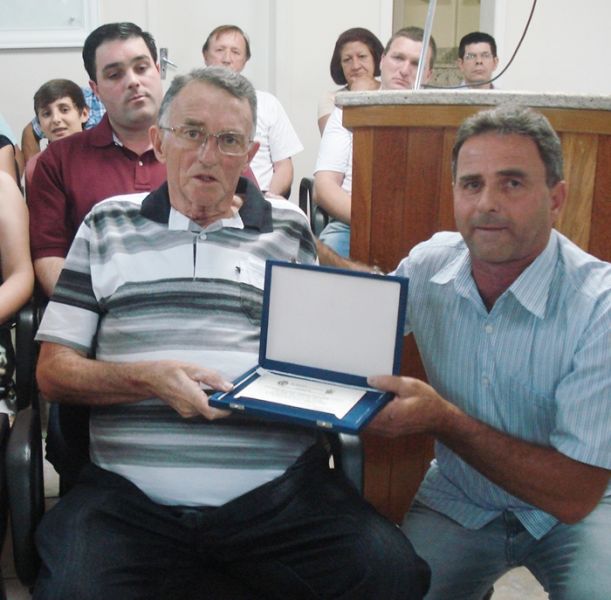 07/11/2012 Casa cheia e sessão marcada por muita emoção durante a entrega da placa de Título de Cidadão Honorário ao ex-prefeito Remi Alécio Mascarello. Familiares e amigos compareceram em peso a sessão de terça-feira (6) para prestigiar o ex-prefeito que recebeu a honraria aprovada por unanimidade pelo Legislativo hervalense e de autoria do vereador Joner Miguelão (PMDB).O Projeto de Decreto Legislativo nº044/2012 visa prestar homenagem e reconhecimento aos serviços prestados por Mascarello ao município de Herval d’Oeste.