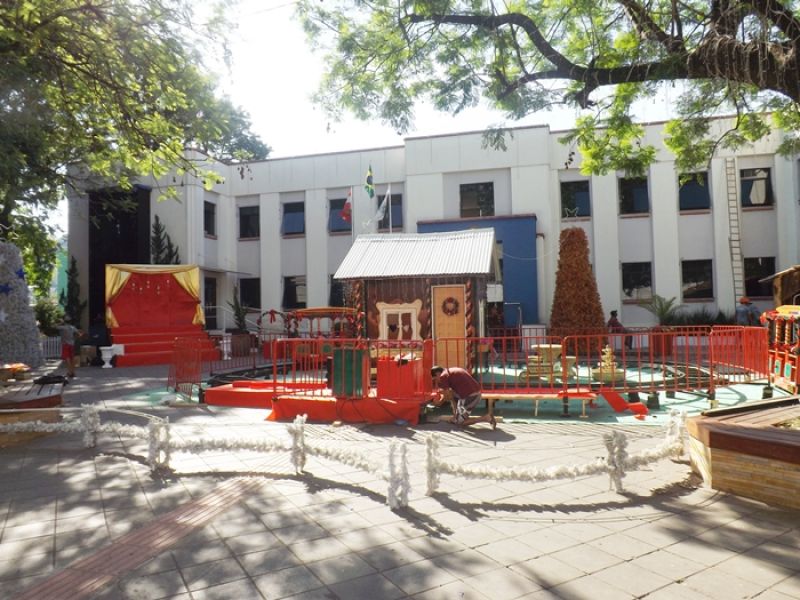 22/11/2012 A praça Adolfo Konder em frente a prefeitura municipal de Joaçaba vai ganhando as cores do Natal. As equipes contratadas pela CDL estão ultimando os preparativos para a abertura do Natal Encantado nesta sexta-feira a partir das 20h30. Na programação a solenidade de abertura da Vila encantada e o acendimento das luzes natalinas. Atrações artísticas locais e um Show com a “Carlos Gomes Big Band” marcam a chegada do Papai Noel.