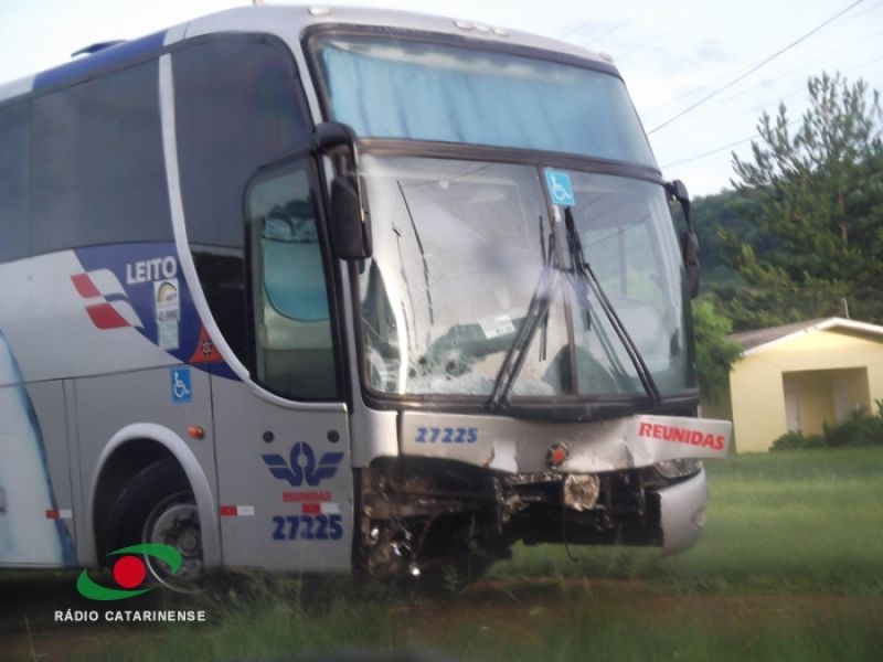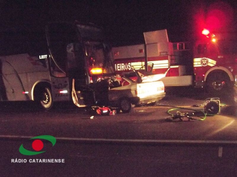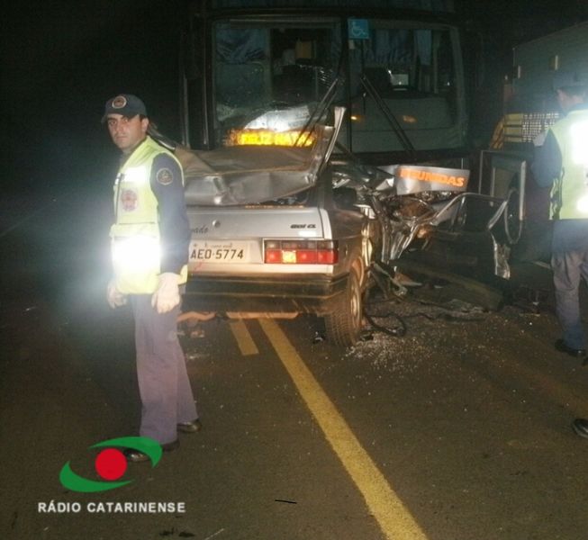 07/12/2012 Um homem morreu na madrugada desta sexta-feira (07) no km 356 da BR-282 em Erval Velho. O acidente aconteceu por volta da 1h30. Colisão frontal entre um ônibus da empresa Reunidas placas MGP-1191 de Caçador, que fazia sentido Florianópolis/Joaçaba, e um VW/Gol placas AED-5774 de Campos Novos, conduzido por Cláudio Alessandro Barbosa, de 28 anos, natural de Campos Novos. Segundo testemunhas, o carro se deslocava sentido Erval Velho/Campos Novos fazendo zigue-zague na pista quando o motorista perdeu o controle, invadiu a pista contrária e bateu de frente com o ônibus. Cláudio Alessandro Barbosa foi socorrido pelo SAMU, mas morreu a caminho do Hospital Universitário Santa Terezinha (HUST) de Joaçaba, nas proximidades da ponte Alfredo Ítalo Remor. O corpo da vítima foi encaminhado ao IML de Joaçaba. Nenhum dos ocupantes do ônibus se feriu. Um laudo da PRF deverá apontar as causas do acidente.