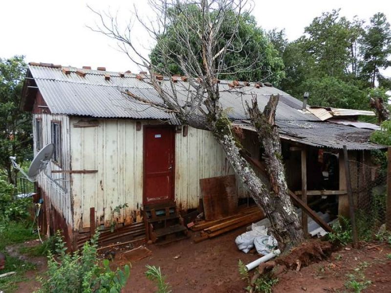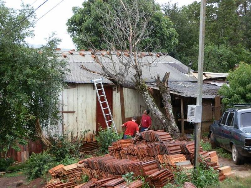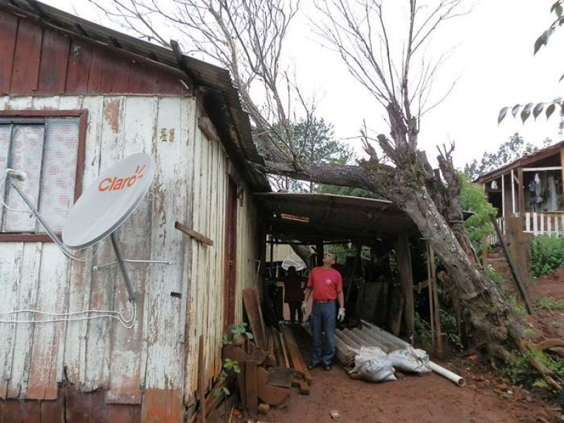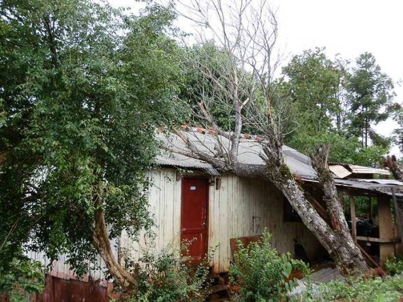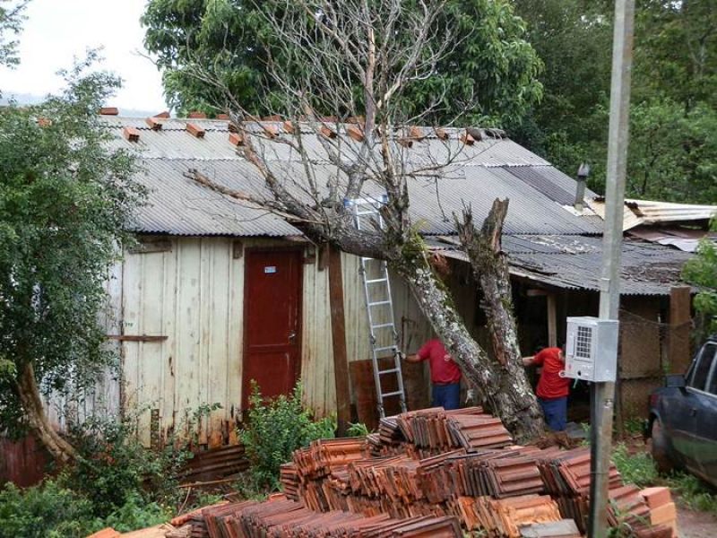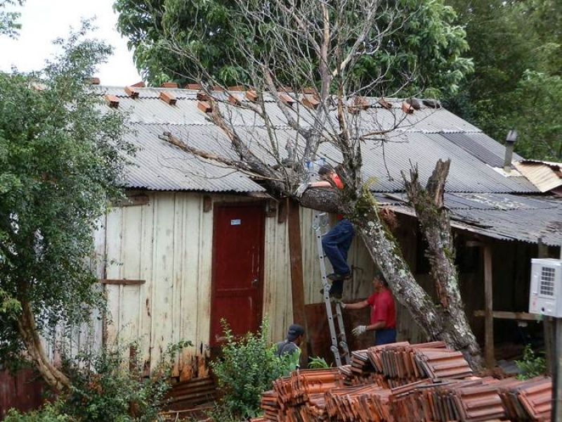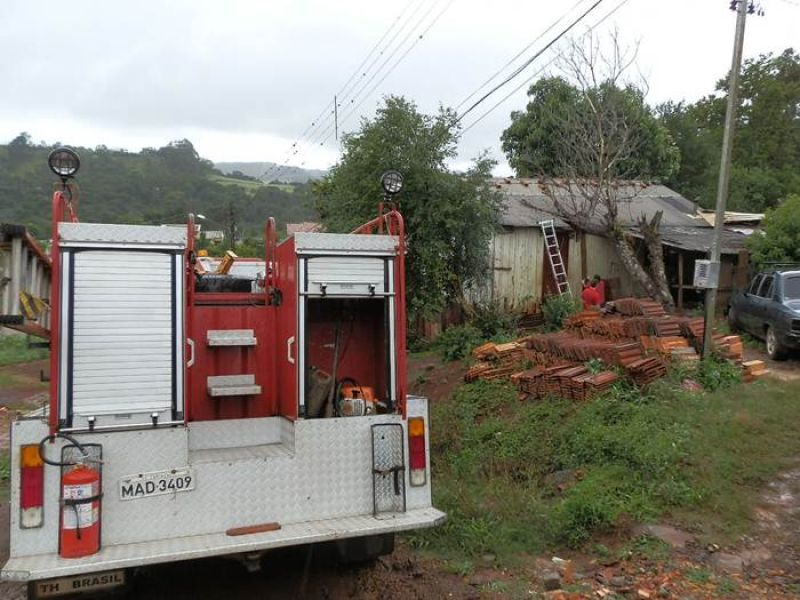 21/12/2012 Moradores de um bairro de Joaçaba levaram um susto na tarde desta sexta-feira (21) depois que uma árvore caiu sobre a casa em que eles residem. O fato foi registrado por volta das 14h30 na rua José Cardoso, bairro Jardim das Hortências. A árvore danificou grande parte do telhado da residência de madeira, de propriedade de Sirlei de Almeida, de 40 anos. Chovia no momento da queda. Os bombeiros tiveram dificuldade de chegar com o caminhão ao local devido às más condições da estrada de terra, que estava escorregadia. Eles retiraram os galhos e em seguida serraram o tronco. Foi necessário providenciar rapidamente a reposição de telhas para evitar que a chuva não invadisse o imóvel. Ninguém se feriu.