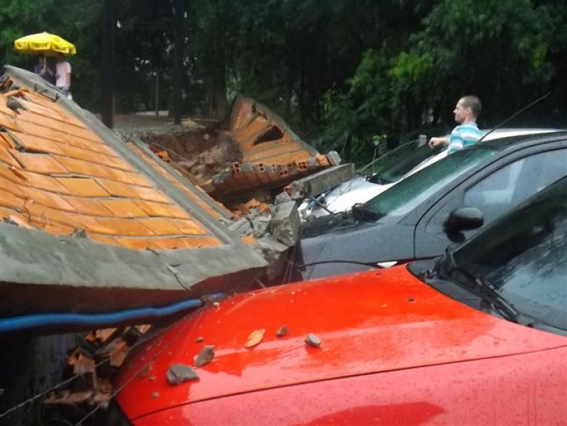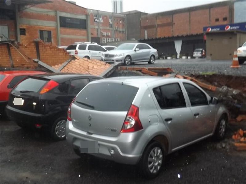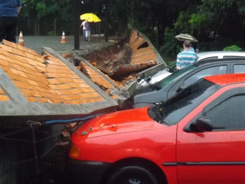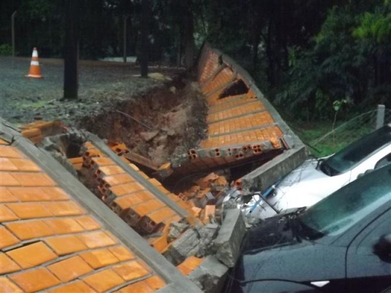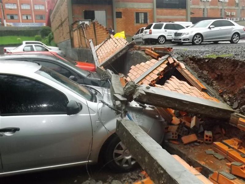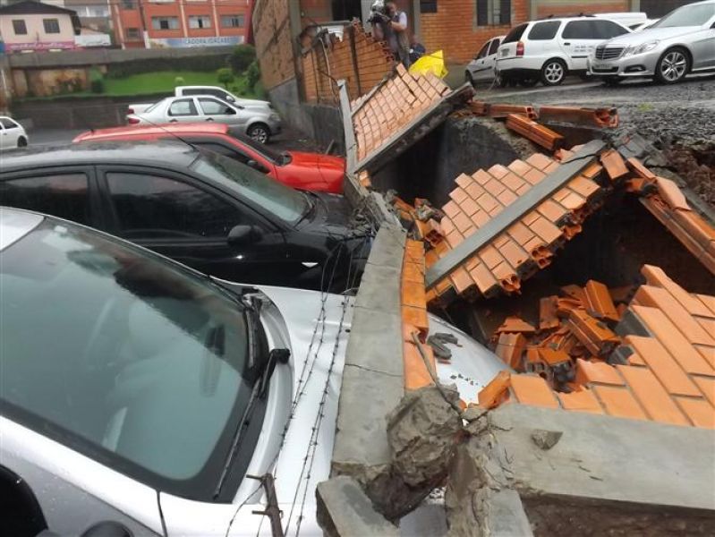 27/12/2012 Três veículos foram atingidos por um muro que desabou na tarde desta quinta-feira (27) em Joaçaba. O fato foi registrado por volta das 16h no estacionamento de um restaurante localizado na avenida Santa Terezinha, nas proximidades do Hospital São Miguel. Os escombros do muro de dois metros de altura por 20 de comprimento danificaram um VW/Gol, um Ford Focus e um Renault Sandero, atingindo principalmente o capô dos carros. O proprietário do estabelecimento acionou a perícia de uma seguradora para, com base no levantamento, tomar as providências cabíveis. Ele se comprometeu em reparar os danos nos veículos. A chuva intensa pode ter contribuído para a queda do muro. Polícia Militar, Corpo de Bombeiros e Polícia Civil foram chamados para prestar apoio à ocorrência. Ninguém ficou ferido.