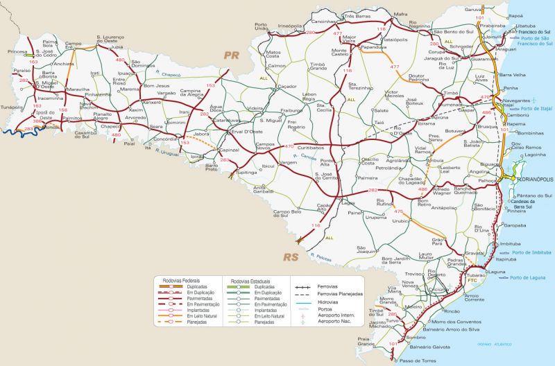 04/01/2013 Santa Catarina tem uma nova versão do mapa rodoviário. A edição de 2013 foi projetada pela diretoria de planejamento do Deinfra (Departamento Estadual de Infraestrutura), tendo como base cartográfica o mapa político do Estado em 2012, da Secretaria de Estado do Planejamento. No mapa atualizado das estradas catarinenses ainda estão disponíveis os números de telefones dos 24 postos do Batalhão da Polícia Militar Rodoviária, além das oito superintendências do Deinfra para informações. A distribuição impressa do Mapa Rodoviário de Santa Catarina começa a ser realizada pelo Deinfra na próxima semana. De acordo com o Departamento Estadual de Infraestrutura, Santa Catarina tem quase 5 mil quilômetros de rodovias estaduais pavimentadas e 1.700 sem cobertura asfáltica. Dos 295 municípios, apenas Paial ainda não conta com acesso pavimentado.