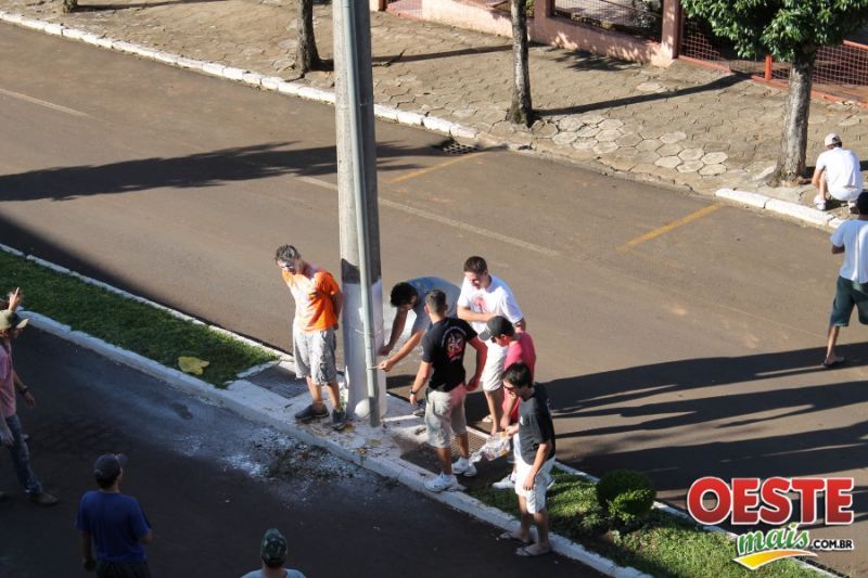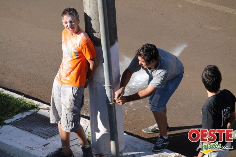 11/01/2013 O jovem pontesserradense Delcio Luiz Castagnaro Filho, 18 anos, que passou em primeiro lugar no vestibular de medicina da UFSC, sofreu um trote bem humorado de um grupo de amigos, na tarde desta sexta-feira, dia 11, em frente ao prédio onde mora em Ponte Serrada. Munidos de cordas, algemas, ovos, farinha, cerveja e outros, eles amarraram Delcio a um poste de energia elétrica e o sujaram com os “presentes”, até mesmo seu cabelo foi cortado, mas tudo em clima de amizade e em momento algum machucaram o jovem, que aceitou a brincadeira. Ele foi aprovado no curso de medicina com média de 86,42. Delcio concedeu entrevista para diversos meios de comunicação nesta sexta-feira.