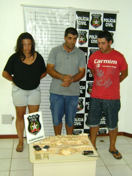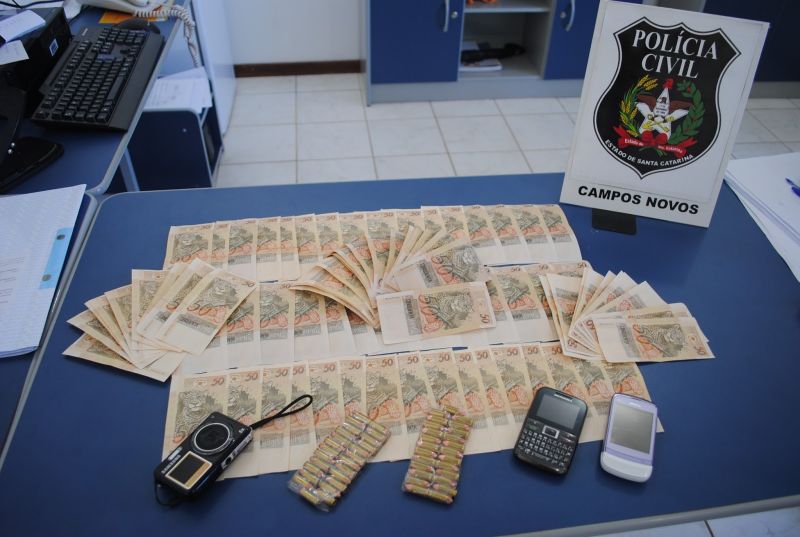 29/01/2013 A Polícia Civil de Campos Novos apreendeu na noite desta segunda-feira (28), R$ 5 mil em notas de cinquenta falsificadas. Junto com o dinheiro foram apreendidas 50 munições calibre 32, uma câmera digital e dois celulares. Segundo o delegado Lucas Fernandes da Rosa, a apreensão ocorreu por volta das 22h, após campana na BR 282, nas proximidades do Posto da PRF, onde um veículo Renalt Clio de cor preta foi seguido pela polícia e abordado na cidade.