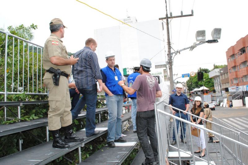 07/02/2013 Visando a segurança das pessoas que vão prestigiar os Desfiles das Escolas de Samba de Joaçaba e Herval d’ Oeste, no sábado (9) e na segunda-feira (11), foi realizada na tarde desta quarta-feira (6) a vistoria dos 144 camarotes e 14 arquibancadas disponibilizadas ao longo da avenida. Participaram representantes da Polícia Militar, Corpo de Bombeiros, Conselho Regional de Engenharia e Agronomia (Crea-SC) e Prefeitura de Joaçaba, além dos responsáveis pela montagem, som e iluminação do palco da festa. A vistoria também foi acompanhada pelo diretor de Patrimônio da Liesjho, engenheiro Diovan Pereira da Rosa.