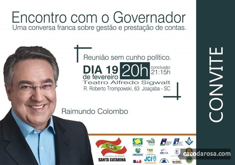 19/02/2013 O governador Raimundo Colombo estará em Joaçaba, nesta terça-feira, 19, para um evento denominado “Encontro com o governador: uma conversa franca sobre gestão e prestação de contas”. A palestra está marcada para as 20 horas, no Teatro Alfredo Sigwalt. De acordo com o secretário de Estado de Assuntos Estratégicos, Geraldo Althoff, que na última semana esteve em Joaçaba para a organização do evento, o objetivo é reunir o maior número de pessoas, com foco nos empresários, entidades e lideranças comunitárias. “Dois encontros com o mesmo objetivo já foram realizados no Estado, em Mafra e São Lourenço do Oeste”, informa. No encontro em Joaçaba, o governador abordará diversos assuntos, como as diretrizes, gestão e questões do dia-a-dia do Governo do Estado. “A intenção é aproximar o governo e a sociedade, divulgando as conquistas e as dificuldades. É uma prestação de contas”, ressalta Althoff. “Todos estão convidados a participar”, reforça.