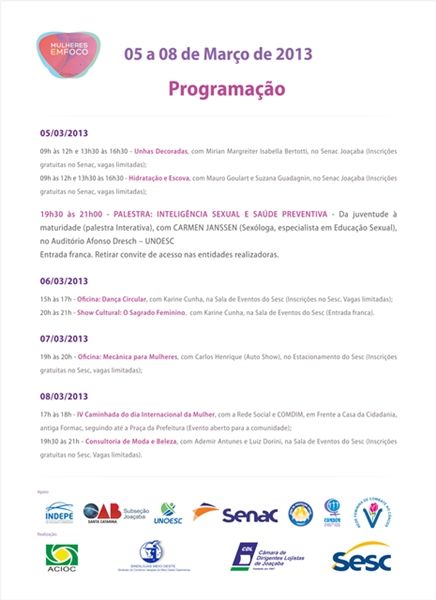 Dia 05 (terça-feira) serão realizadas duas oficinas no SENAC sendo uma de “Unhas Decoradas” e a outra “Hidratação e Escova”. As vagas são limitadas. À noite das 19h30 às 21h palestra no auditório Afonso Dresch tendo como tema “Inteligência Sexual e Saúde Preventiva”. A palestra será ministrada por uma sexóloga e a entrada é franca.