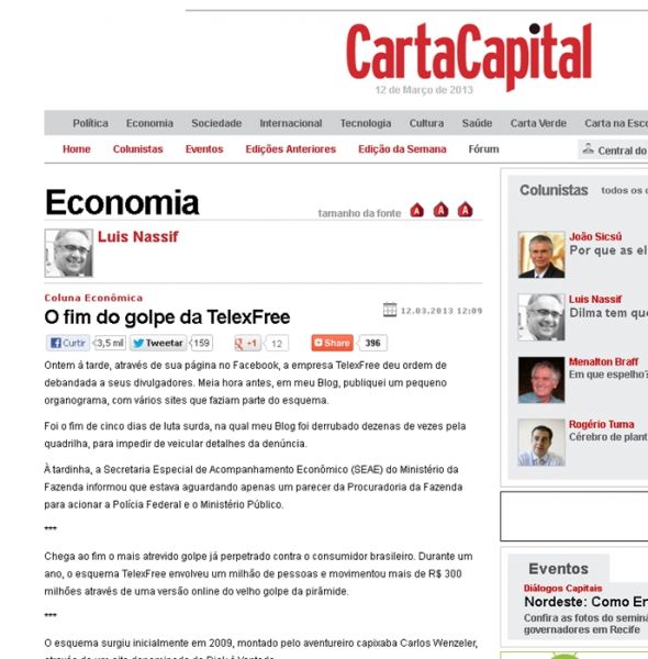 A coluna de Luis Nassif, um dos mais respeitados economistas do Brasil, leva como título: “O fim do golpe da TelexFree”. Ele cita que o sistema criado já movimentou mais de R$ 300 milhões.