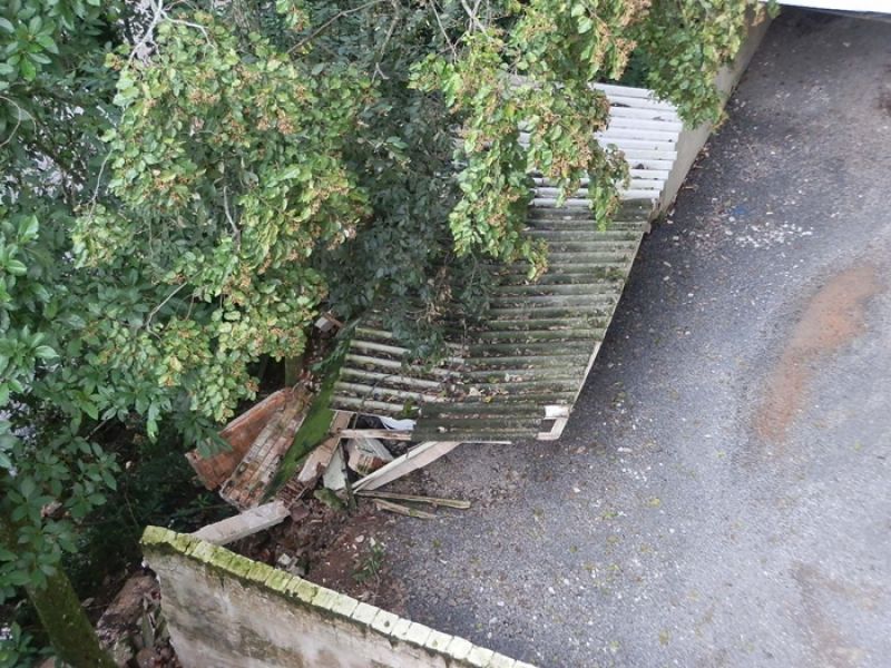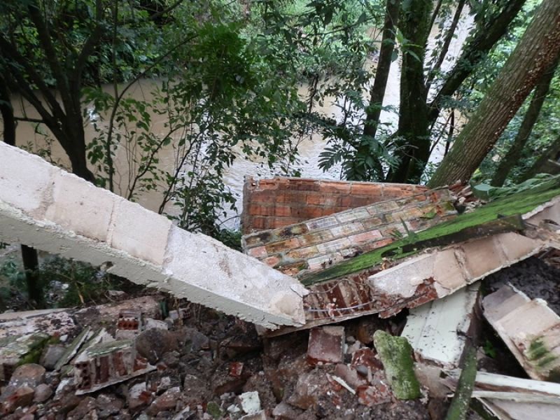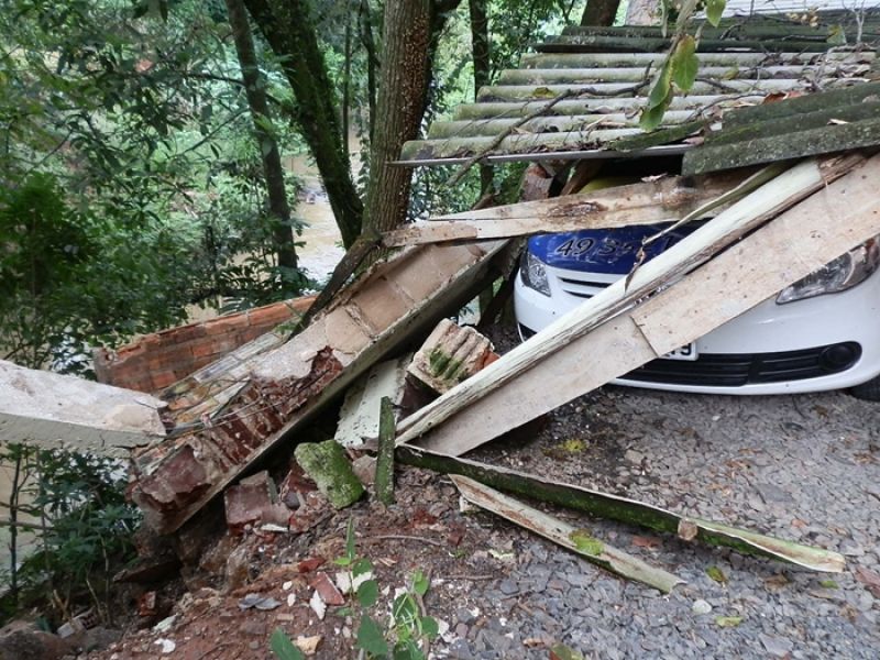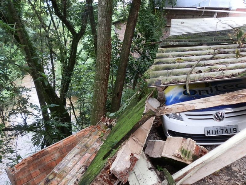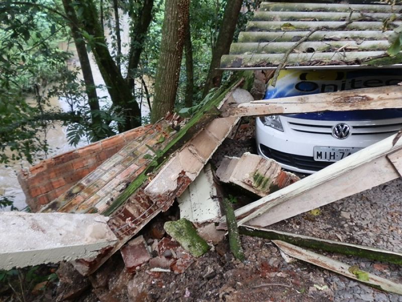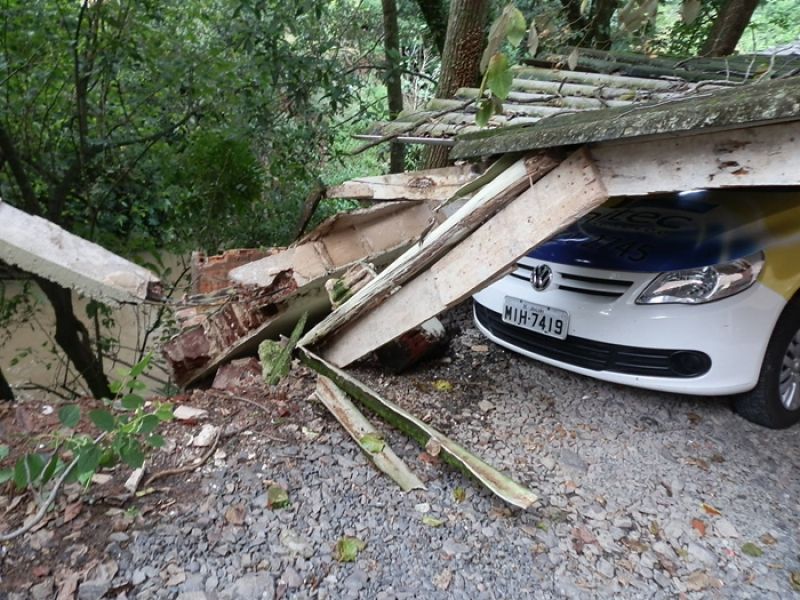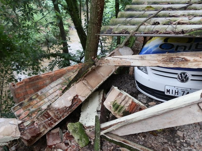14/03/2013 O telhado de uma garagem desabou parcialmente na madrugada desta quinta-feira (14) e atingiu um veículo em Joaçaba. O fato foi registrado nos fundos de prédio na avenida XV de Novembro, ao lado da Rádio Catarinense. O veículo que pertence a uma empresa de informática ficou coberto de entulhos e correndo o risco de cair no Rio do Tigre. Ninguém se feriu, apenas foram registrados danos matérias de média monta.