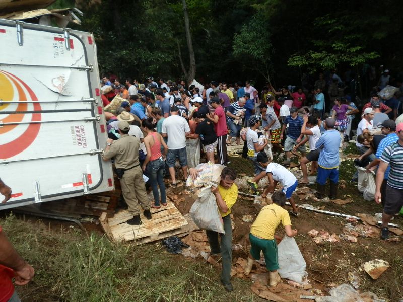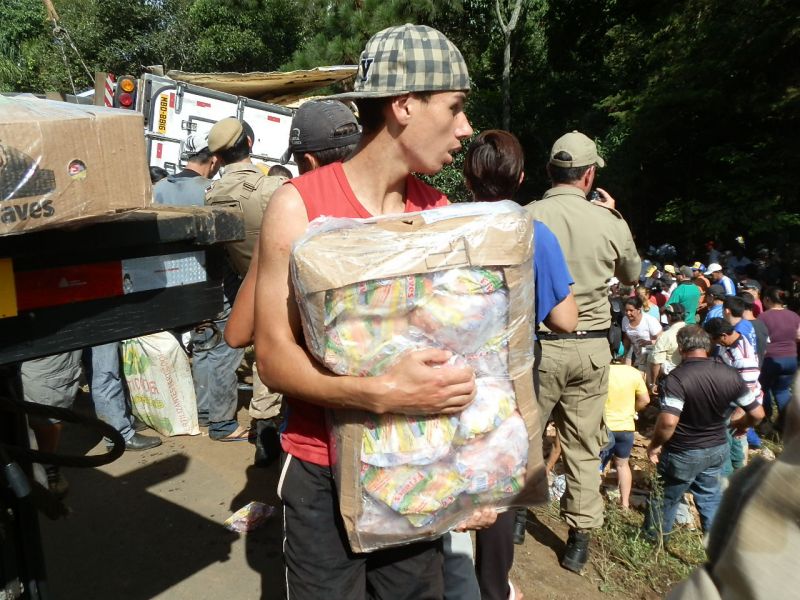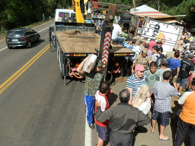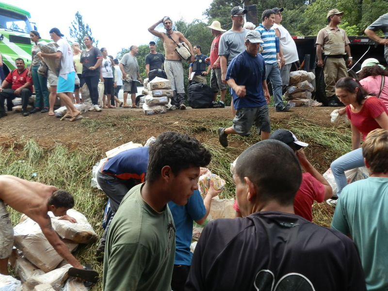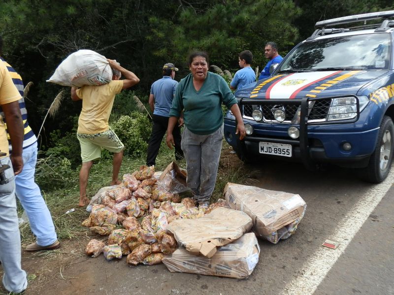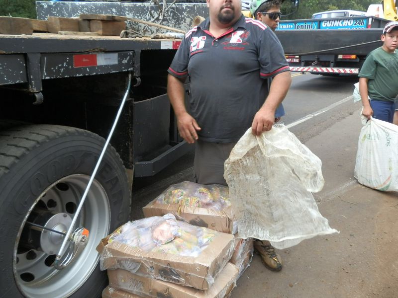 27/03/2013 Uma cena curiosa foi registrada nas margens da BR-282 em Joaçaba nesta terça-feira (26). Logo após a notícia de que uma carreta havia tombado, próximo ao CPJ na curva da Marta, uma multidão de pessoas se deslocou até o local com expectativa de ter acesso a carga de frango. Cerca de 30 toneladas de coxa e sobrecoxa, em caixas, ficaram esparramadas pelo acostamento. A carreta frigorífica ficou destruída em razão do acidente e a empresa decidiu autorizar o saque. Por volta das 14h30 a notícia da liberação foi comunicada as pessoas e em questão de segundos as filas se desfizeram e a multidão tomou conta do acostamento. Para levar os frangos em pedaços, foram usados sacos de ráfia, sacolas plásticas, caixas de papelão e até carinhos. Toda carga foi resgatada pela população em questão de minutos. Filas de veículos se formaram nos dois sentidos da rodovia.