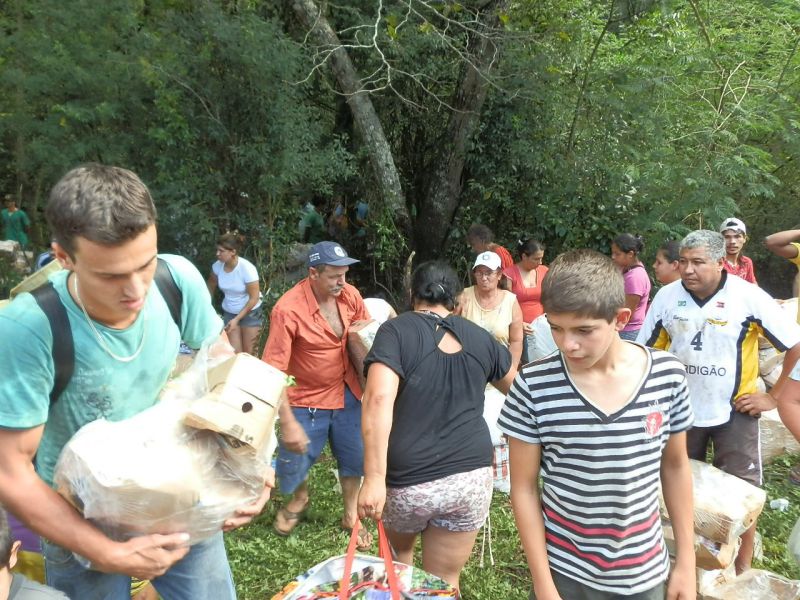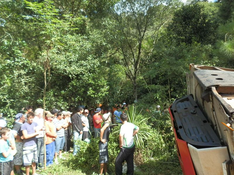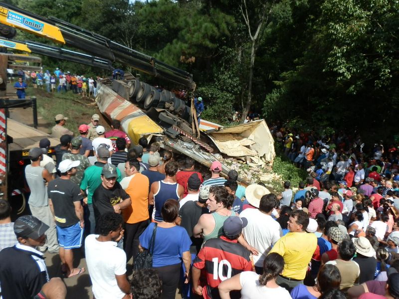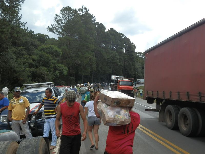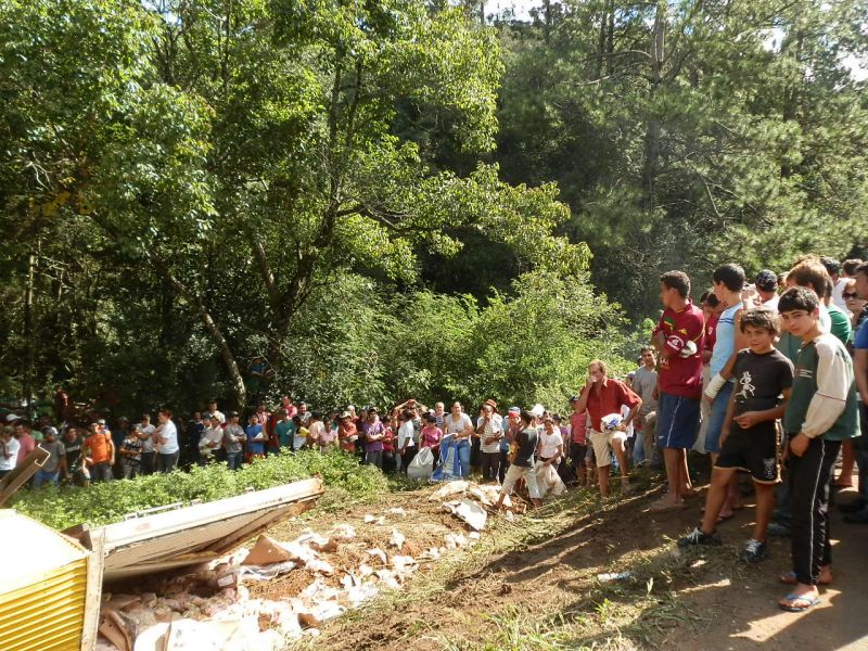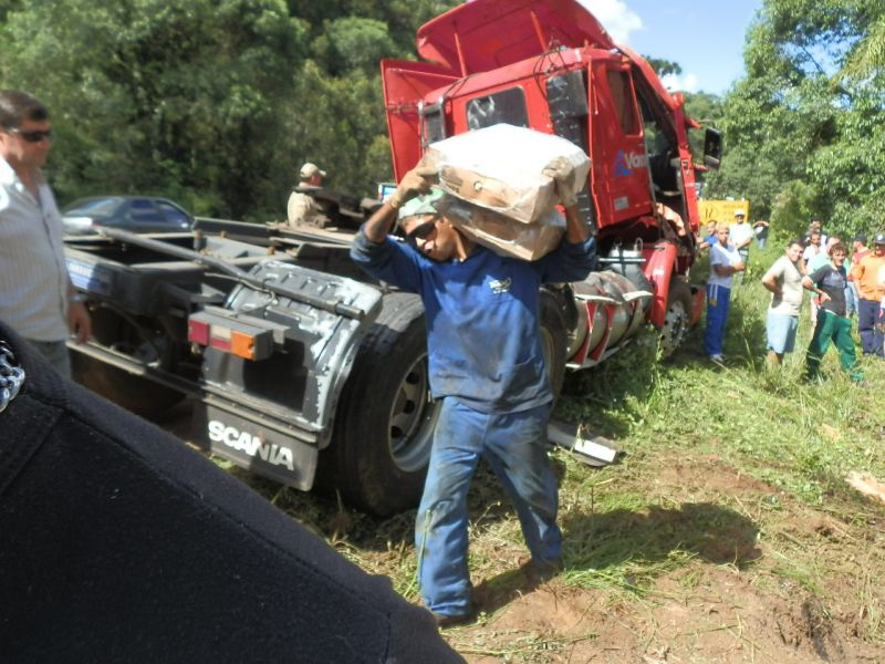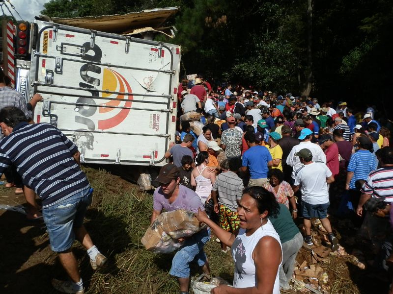 27/03/2013 Uma cena curiosa foi registrada nas margens da BR-282 em Joaçaba nesta terça-feira (26). Logo após a notícia de que uma carreta havia tombado, próximo ao CPJ na curva da Marta, uma multidão de pessoas se deslocou até o local com expectativa de ter acesso a carga de frango. Cerca de 30 toneladas de coxa e sobrecoxa, em caixas, ficaram esparramadas pelo acostamento. A carreta frigorífica ficou destruída em razão do acidente e a empresa decidiu autorizar o saque. Por volta das 14h30 a notícia da liberação foi comunicada as pessoas e em questão de segundos as filas se desfizeram e a multidão tomou conta do acostamento. Para levar os frangos em pedaços, foram usados sacos de ráfia, sacolas plásticas, caixas de papelão e até carinhos. Toda carga foi resgatada pela população em questão de minutos. Filas de veículos se formaram nos dois sentidos da rodovia.