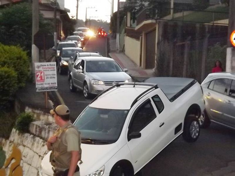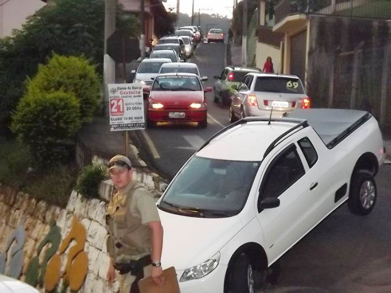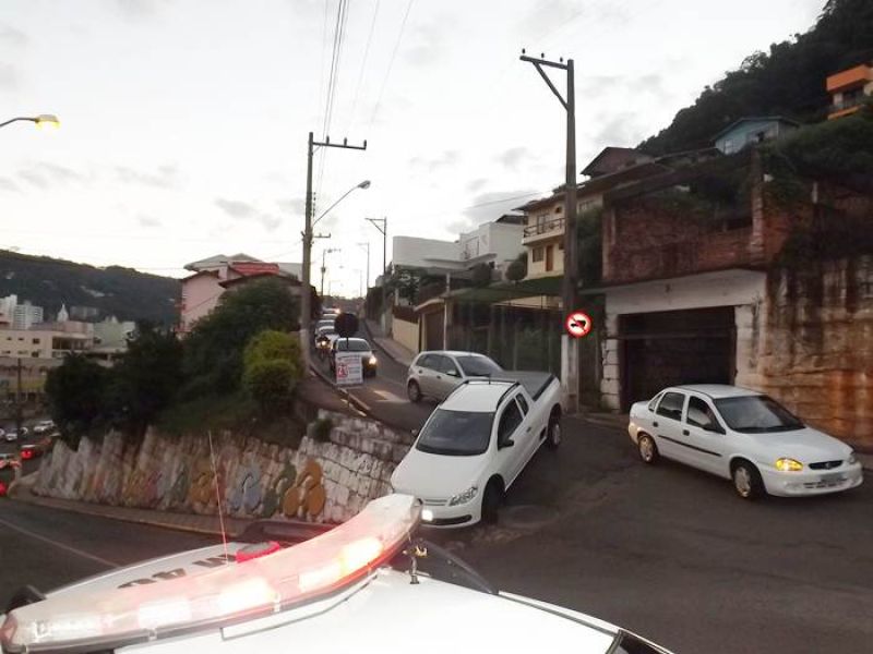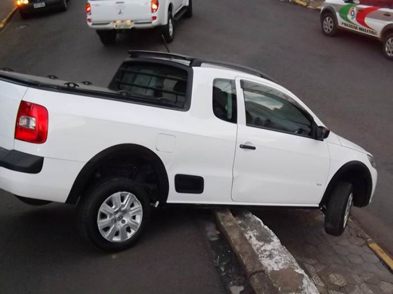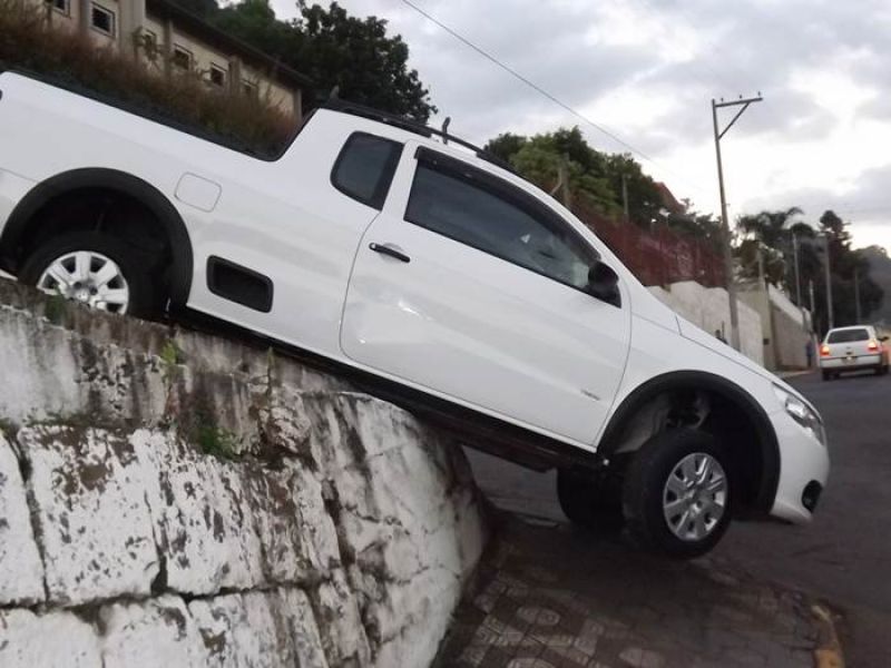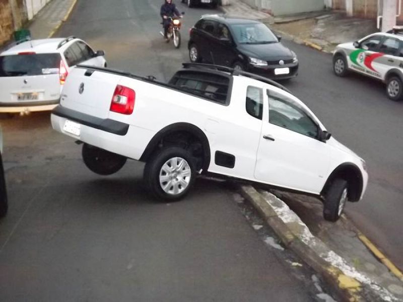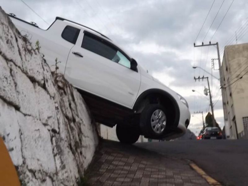 28/03/2013 Uma Saveiro com placas de Joaçaba ficou suspensa em uma bifurcação no centro de Joaçaba no final da tarde desta quarta-feira (27). O fato inusitado aconteceu por volta das 18h na rua Frei Rogério. O motorista, de iniciais S.V.S., de 88 anos, acabou fazendo uma manobra equivocada que ocasionou o incidente. O carro ficou com a parte traseira sobre o asfalto e a frente no ar, totalmente encavalada. A Polícia Militar foi chamada e orientou o trânsito, que ficou congestionado por cerca de uma hora. Foi necessário que um guincho fizesse a retirada do veículo e normalizasse novamente o fluxo de carros. O motorista não se feriu.