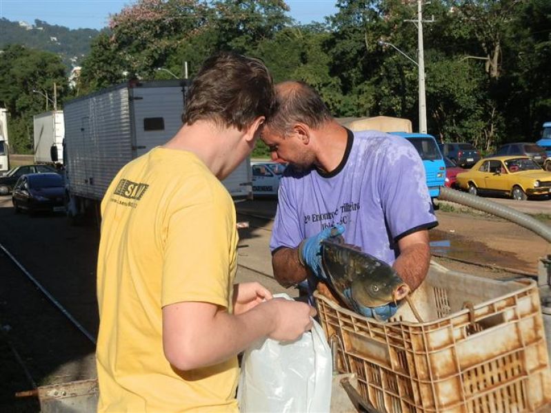 28/03/2013 Iniciou às 08h desta quinta-feira (28) na praça do Ferroviário em Herval d' Oeste, a tradicional Feira do Peixe Vivo, uma das principais da região. Desde os primeiros minutos uma extensa fila de consumidores aguardava para adquirir o produto. Estão sendo vendidas Carpas (Capim, Húngara e Chinesa) e Pacu, com peso que varia de um a oito quilos e preços variando de R$ 6,50 à R$ 9,00. A feira é organizada pelo Pasque-Pague Colinas que capturou cerca de três toneladas para serem comercializadas. Os peixes foram capturados com uso de redes que são passadas nos açudes. Os peixes estão armazenados em tanques com oxigênio. A venda prossegue até o final do dia ou enquanto durar o estoque. Em 2012 foram vendidos 2,7 toneladas de peixe. Também haverá, por volta das 15h30, um “arrastão” nos açudes do pesque pague em Luzerna.