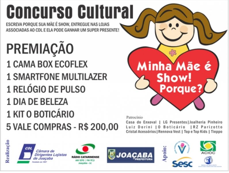 22/04/2013 Minha Mãe é Show! A Câmara dos Dirigentes Lojistas de Joaçaba (CDL) quer saber por que e vai premiar os melhores textos. Este é o objetivo de uma campanha alusiva ao Dia das Mães que está sendo lançada em parceria com as rádios Catarinense AM-FM, Band FM, prefeitura municipal e mais dez empresas patrocinadoras. Os filhos terão 10 linhas para escrever um texto e participar do concurso que será julgado por uma comissão formada por representantes dos promotores do evento e jornalistas da região. As cartas poderão ser entregues a partir desta segunda-feira (22) até o dia 08 de maio nas lojas associadas à CDL que estarão identificadas com o cartaz da campanha. Serão mais de R$ 3 mil em prêmios que serão entregues no dia 11 de maio durante um grande evento que acontecerá na praça Adolfo Konder, em frente a prefeitura.
