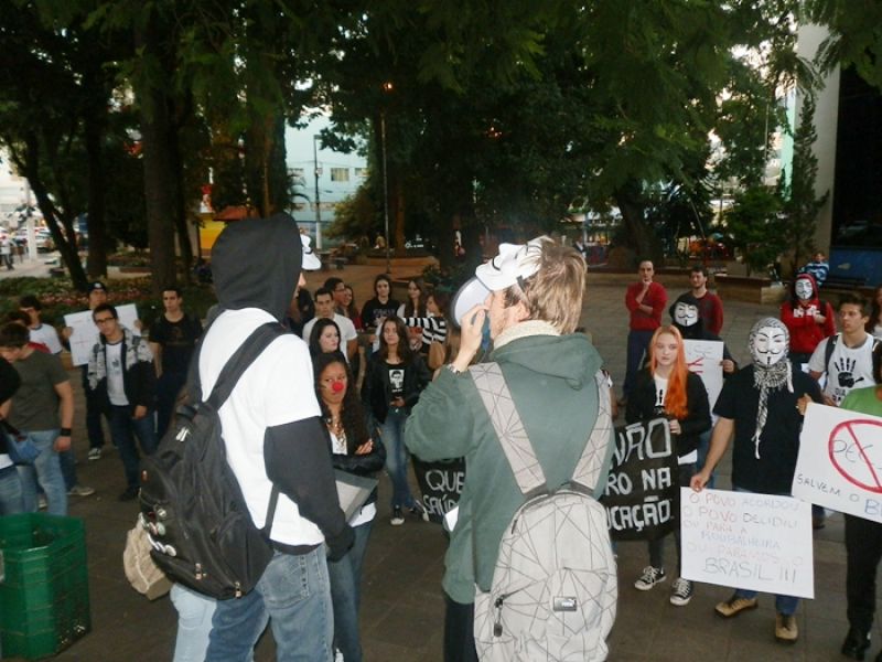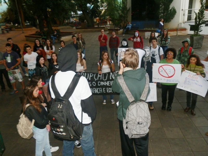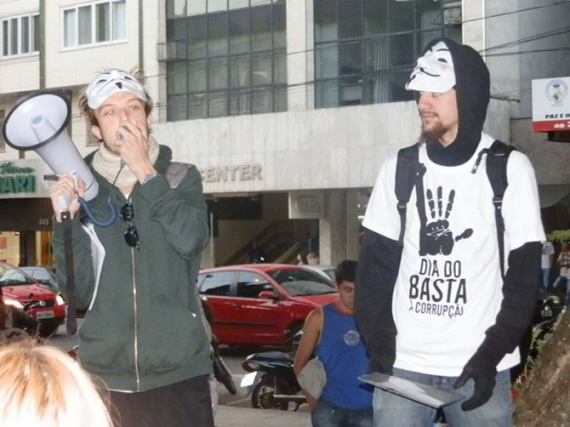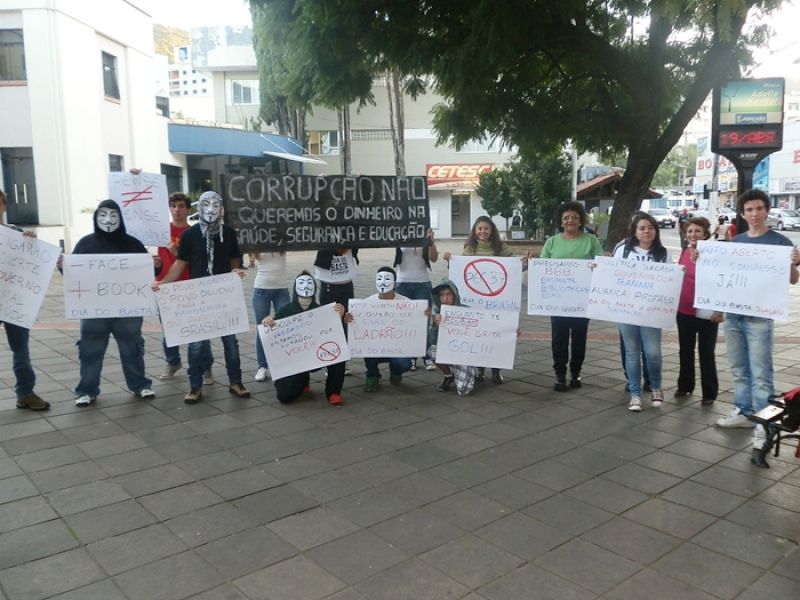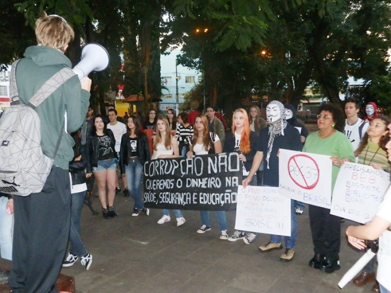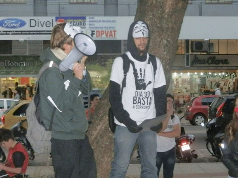 19/04/2013 Um grupo de aproximadamente 60 pessoas participou no fim da tarde desta sexta-feira (19) do Dia do Basta em Joaçaba. A concentração dos manifestantes, que transcorreu de forma pacífica, foi na praça Adolfo Konder, em frente à prefeitura. O movimento foi organizado pelo estudante universitário Felipe Matos, eleito no fim do ano passado como coordenador nacional do Dia do Basta. Matos explicou que o movimento tem caráter nacional e pede o fim do voto secreto do Congresso Nacional, a não aprovação da PEC 37, a chamada PEC da Impunidade, que pode impedir o Ministério Público de realizar investigações, entre outras metas. Ele conta que no ano passado o movimento aconteceu em Campos Novos. O coordenador ressalta que Joaçaba foi escolhida para receber o evento por ser uma cidade de população jovem. “Precisa haver essa mudança na política nacional, independente da classe social a corrupção afeta a todos”, enfatiza. O Dia do Basta é um movimento social apartidário e sem fins lucrativos. Tem como objetivo o resgate da ética e da moralidade nos poderes Legislativo, Executivo e Judiciário no Brasil, em todos os níveis da administração pública seja nacional, estadual ou municipal. O movimento é a favor de um Brasil livre de impunidade e corrupção.