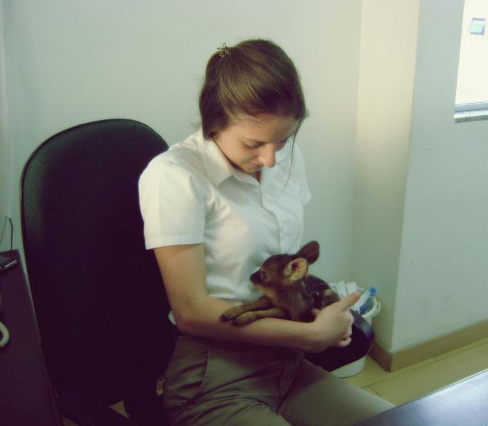 03/05/2013 Um filhote de veado virou a atração na sede da Polícia Militar Ambiental em Herval d' Oeste. O animal, com poucos dias de vida, foi localizado nesta quinta-feira (02) às margens da BR-282 pela Polícia Rodoviária Federal (PRF), após a mãe ter sido morta por atropelamento. O filhote foi deixado pela PRF aos cuidados da Polícia Ambiental. Como ainda é indefeso, o bichinho logo foi encaminhado para atendimento veterinário em uma clínica, onde ficará até atingir formação suficiente para voltar à natureza. O filhote foi um espetáculo à parte na sede da Ambiental, pois, pulava de um lado para o outro para escapar de quem quisesse pegá-lo.