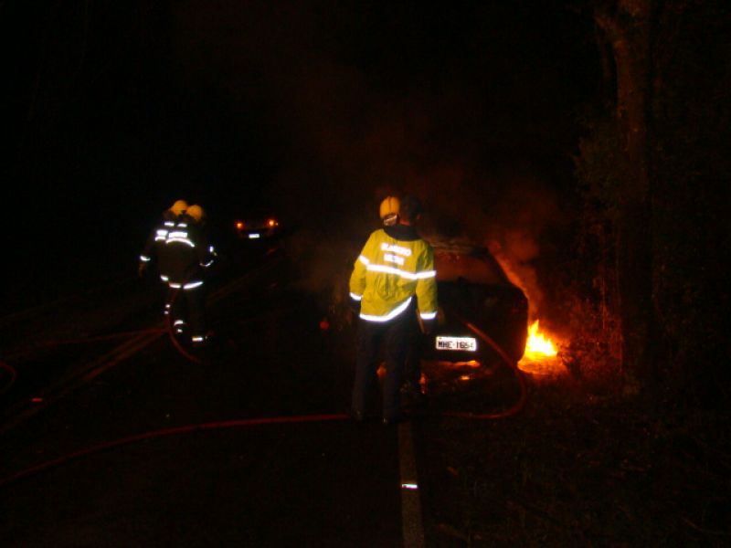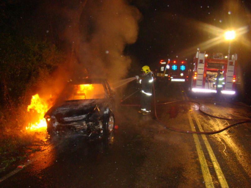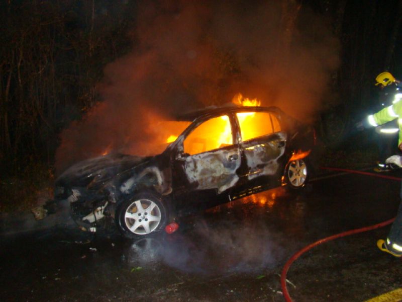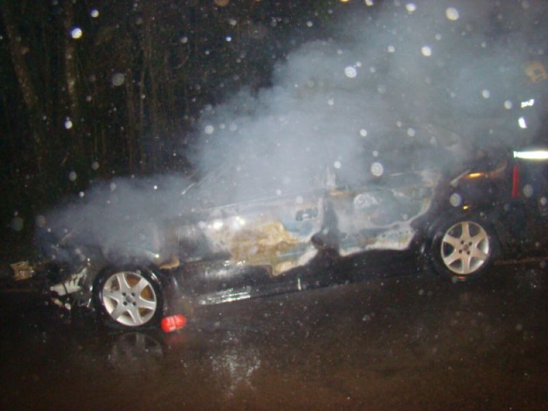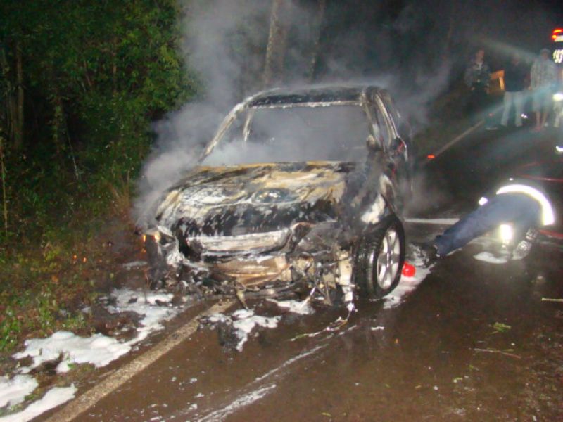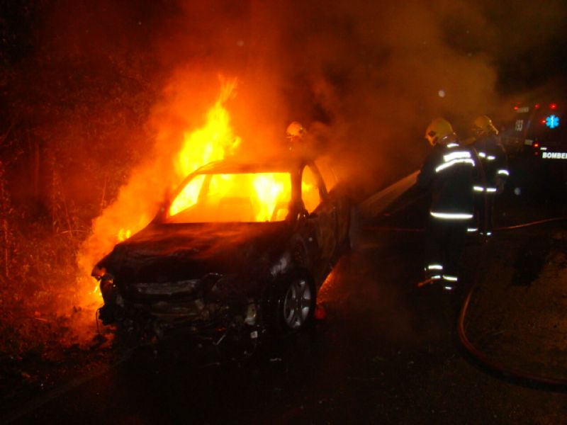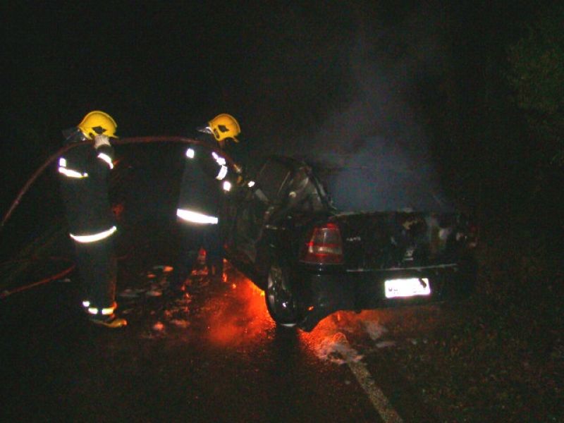 25/05/2013 Um carro pegou fogo após colidir no acesso a Herval d’ Oeste na madrugada deste sábado (25). A ocorrência foi registrada por volta da 1h20 no acesso Egídio Pozzobom, que liga com a BR-282. Um Astra de Vargeão (SC) fazia sentido Herval quando atravessou a pista contrária, colidiu contra árvores no barranco e incendiou. Quando a Polícia Militar chegou não havia ninguém. A informação repassada por um motorista que passou pelo local e acionou a polícia, foi de que os ocupantes do carro, cujo número ainda não se sabe, estariam possivelmente embriagados. Eles teriam fugido com o auxílio de outro veículo. O Corpo de Bombeiros combateu as chamas por cerca de 20 minutos. Durante a ação a pista ficou bloqueada. Os bombeiros também fizeram a limpeza do óleo que vazou em grande quantidade no asfalto. O Astra teve perda total. Não há registro de furto. Ele foi removido por um guincho.
