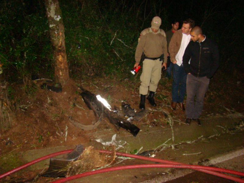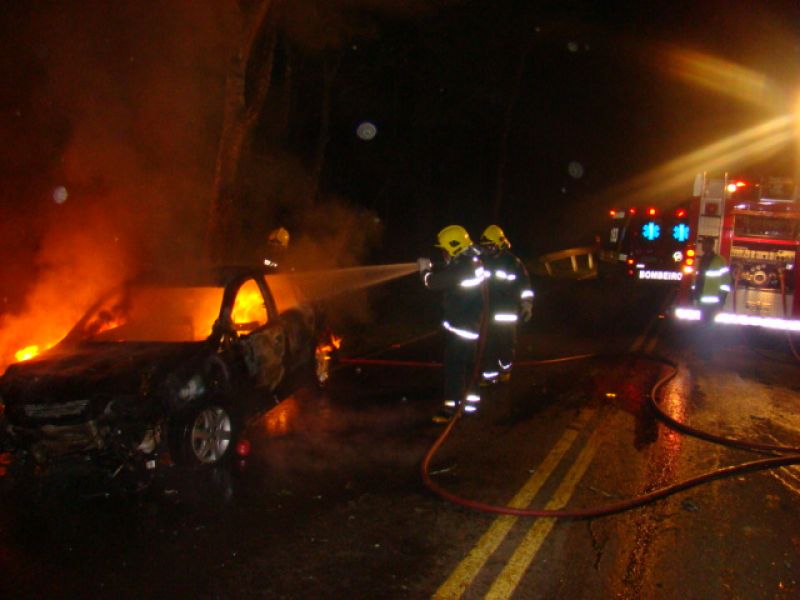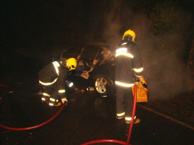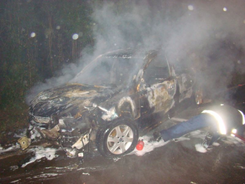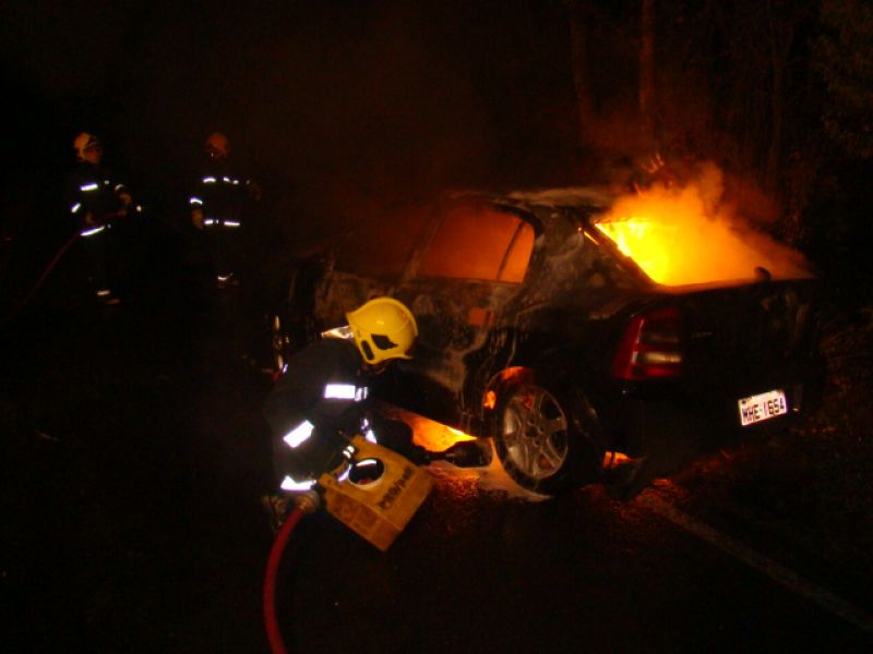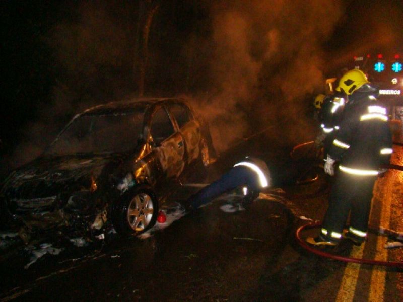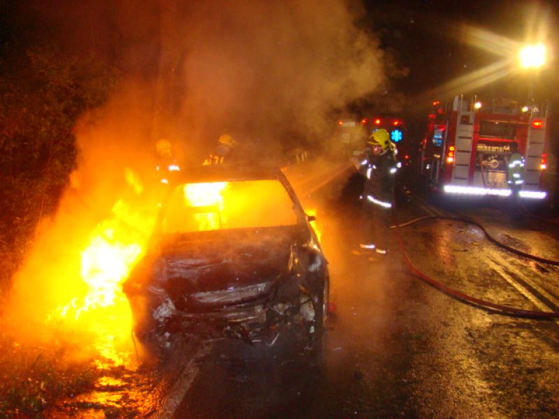 25/05/2013 Um carro pegou fogo após colidir no acesso a Herval d’ Oeste na madrugada deste sábado (25). A ocorrência foi registrada por volta da 1h20 no acesso Egídio Pozzobom, que liga com a BR-282. Um Astra de Vargeão (SC) fazia sentido Herval quando atravessou a pista contrária, colidiu contra árvores no barranco e incendiou. Quando a Polícia Militar chegou não havia ninguém. A informação repassada por um motorista que passou pelo local e acionou a polícia, foi de que os ocupantes do carro, cujo número ainda não se sabe, estariam possivelmente embriagados. Eles teriam fugido com o auxílio de outro veículo. O Corpo de Bombeiros combateu as chamas por cerca de 20 minutos. Durante a ação a pista ficou bloqueada. Os bombeiros também fizeram a limpeza do óleo que vazou em grande quantidade no asfalto. O Astra teve perda total. Não há registro de furto. Ele foi removido por um guincho.