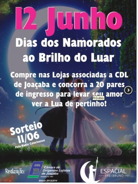 28/05/2013 O Dia dos Namorados está se aproximando e junto com ele a expectativa dos lojistas de Joaçaba em se tratando de vendas, já que a data e uma das mais importantes do calendário. Para estimular os consumidores a Câmara dos Dirigentes Lojistas (CDL) está promovendo a campanha “12 de Junho Dia dos Namorados ao Brilho do Luar”. Os consumidores que comprarem nas lojas associadas da CDL estarão recebendo cupons para concorrer ao sorteio de 20 pares de ingressos para levar seu amor ver a lua bem de perto. O Centro de Observação Espacial Frei Bruno estará abrindo as portas para os 20 casais contemplados na quarta-feira (12/06). O sorteio dos ingressos acontecerá ao vivo na terça-feira (11/06) através da Rádio Catarinense a partir das 18h no programa Rádio Contato. A promoção e realização da campanha é da CDL em parceria com o Centro de Observação Espacial.