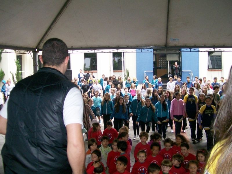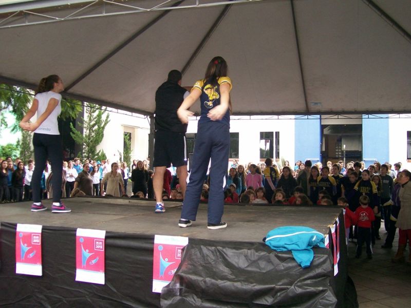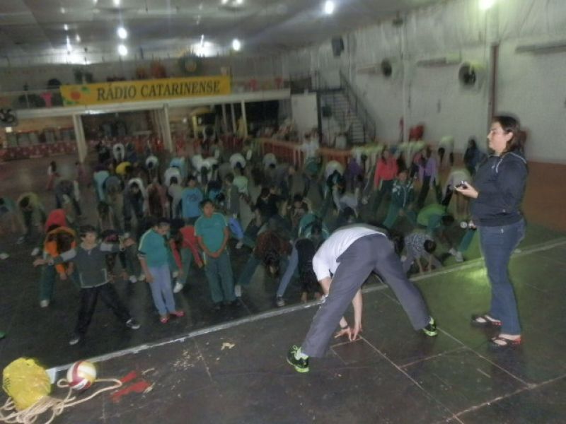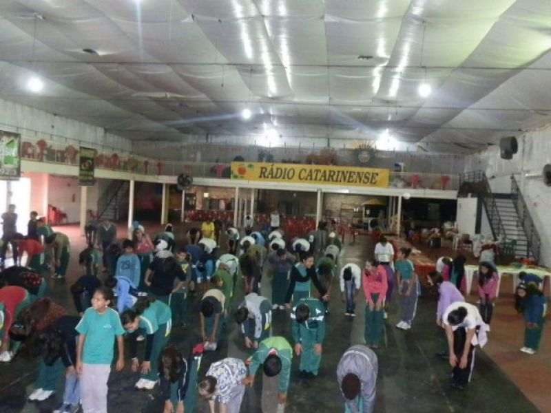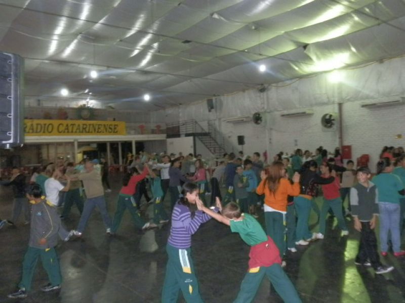 até às 21h quando encerra a participação. A superintendente salienta que, além de integrar a comunidade, a intenção é que a população crie o hábito de praticar atividades físicas. O registro das atividades pode ser feito pelo telefone da FMEC (3521-3234) ou através do ponto de registro na praça da prefeitura. Ao término os dados serão encaminhados ao SESC Joaçaba, que por sua vez enviará para São Paulo. A abertura da programação contou com a participação de alunos da escola municipal Clara Zomkowski do bairro Flor da Serra. Conforme a diretora, Rosana Heberle, foram 75 crianças de 4 e 5 anos que há três anos participam consecutivamente do Dia do Desafio, que é realizado há quatro anos. Ela completa que à tarde haverá atividade com alunos e os profissionais que atuam na escola no período vespertino.