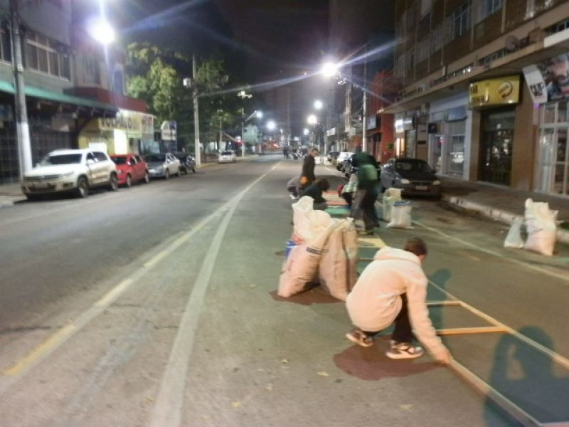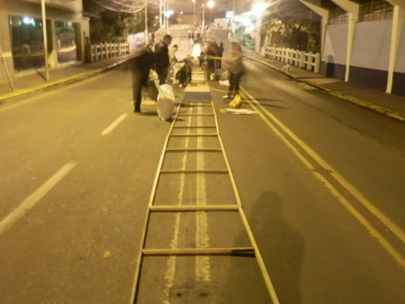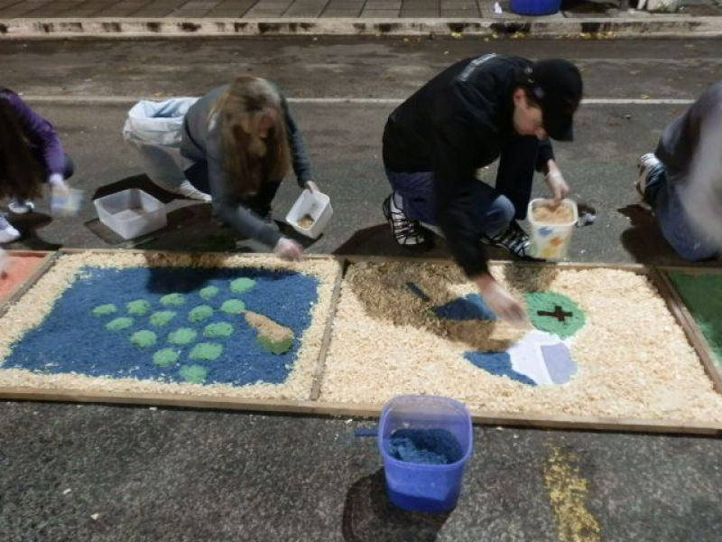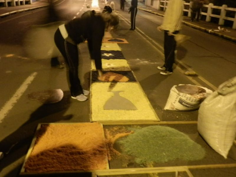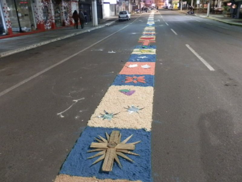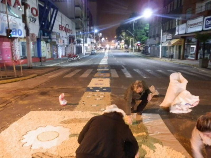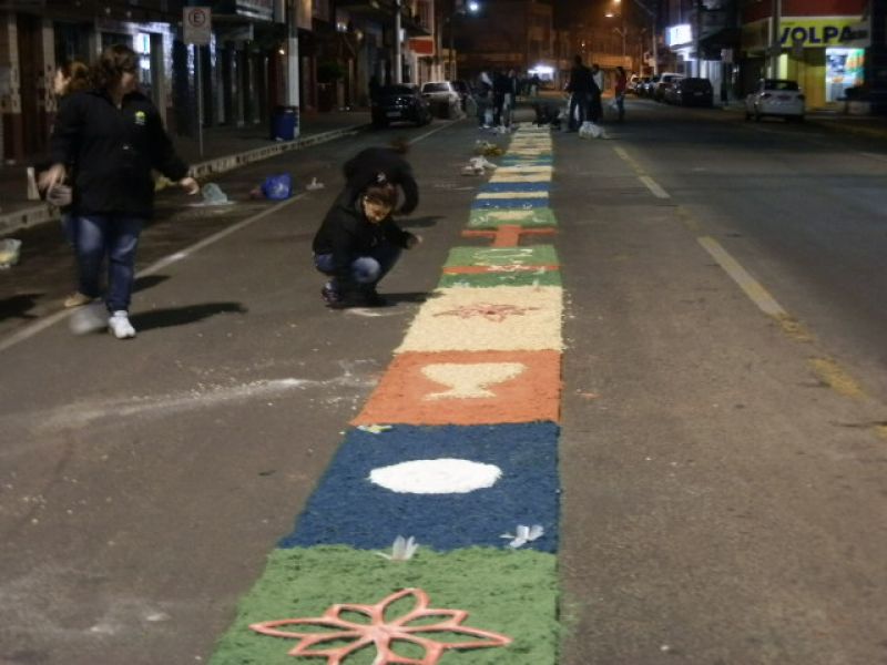 30/05/2013 Parte da avenida XV de Novembro em Joaçaba amanheceu coberta por um grande tapete artesanal. Os tapetes de rua são uma tradição e manifestação artística popular realizada por fiéis da Igreja Católica, confeccionados para a passagem da procissão de Corpus Christi. Em Joaçaba um grupo de voluntários iniciou os trabalhos por volta das cinco horas da manhã para deixar tudo pronto para a procissão.