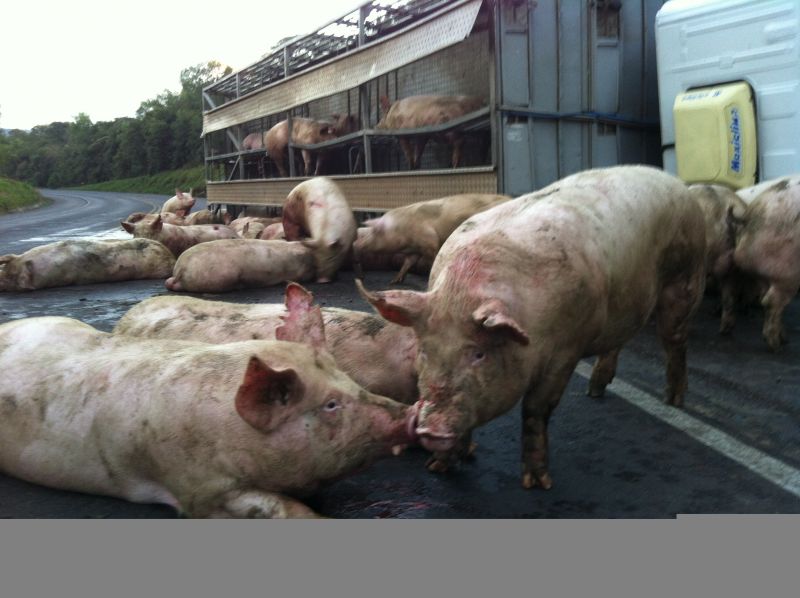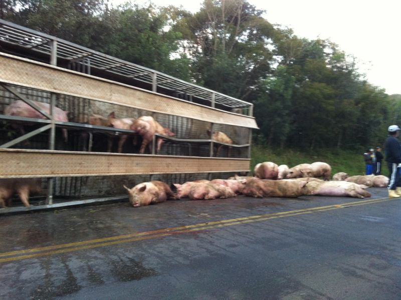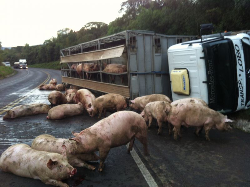 06/06/2013 Um caminhão carregado de suínos tombou na BR-153, na comunidade de Caroveira, em Irani. O motorista Valdemir da Silva não teve ferimentos. O caminhão porcadeiro com placas de Concórdia saiu da pista e tombou ficando na rodovia. Alguns animais morreram e outros ficaram feridos, porém muitos estavam espalhados a pista. A Polícia Rodoviária Federal pede a atenção dos motoristas que transitam pela BR-153. Os policiais estiveram no local para fazer a sinalização e levantamentos para apurar as causas do acidente. No momento do acidente havia muita neblina no local e o caminhão fazia o sentido Irani a Concórdia quando houve o acidente. O trânsito segue em meia pista até a retirada dos animais e do caminhão.