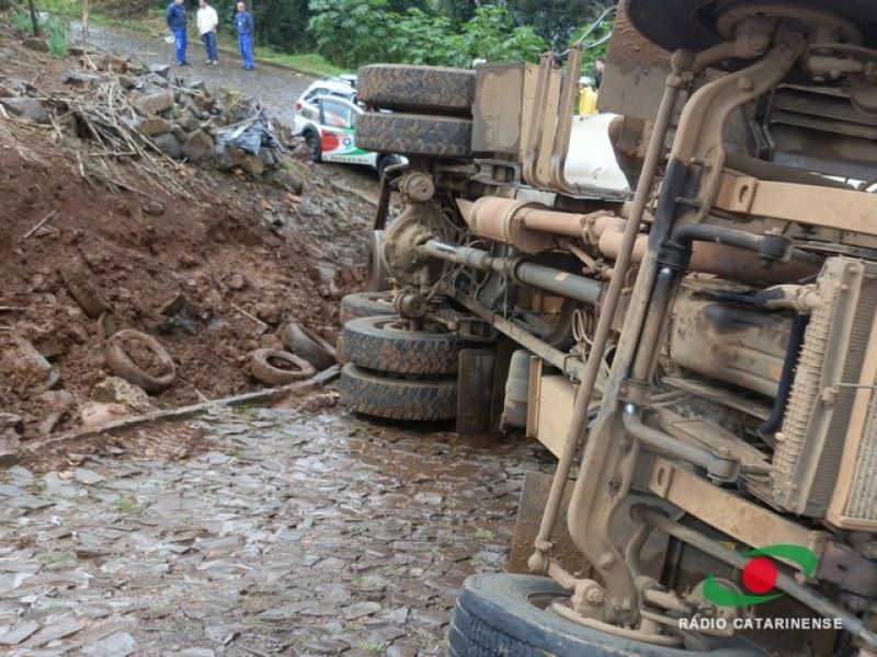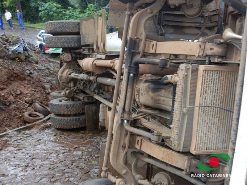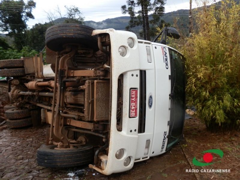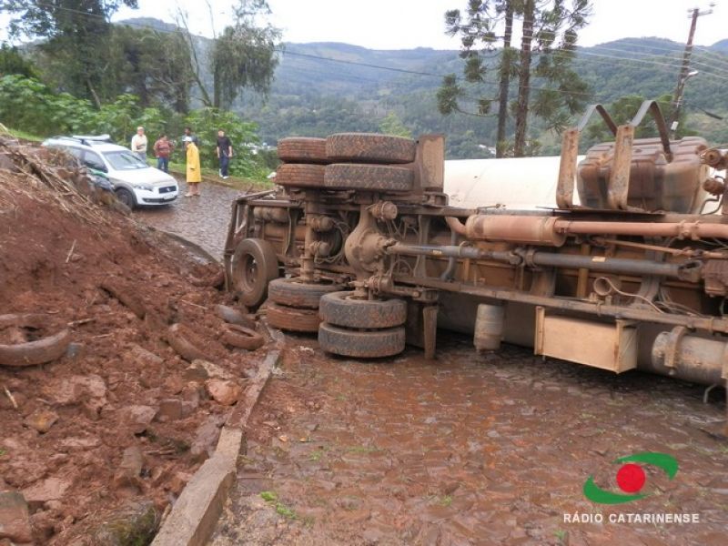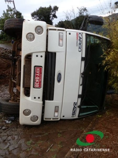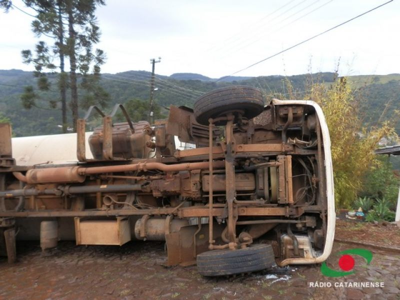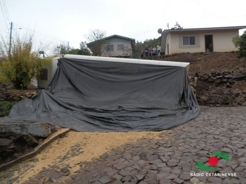 19/06/2013 Um caminhão carregado com 12 toneladas de ração para aves por muito pouco não provocou uma tragédia no bairro Frei Bruno em Joaçaba na manhã desta quarta-feira (19). O caminhão (MYY-8438) com placas de Rio Verde, Goiás, tombou em via pública após tentar subir uma ladeira. O motorista José Valdecir Duarte, 42 anos, relatou a Rádio Catarinense que perdeu o controle do caminhão após o mesmo patinar no calçamento molhado. Mesmo acionando os freios, o caminhão deslizou ladeira abaixo. A única alternativa do motorista foi tentar desviar das casas, manobrando para que o veículo atingisse um barranco. Após colidir contra a encosta o caminhão tombou na pista, interditando a via. Apenas danos materiais foram registrados. Moradores, revoltados, cobraram providências por parte da prefeitura. O caminhão levaria ração para um aviário.