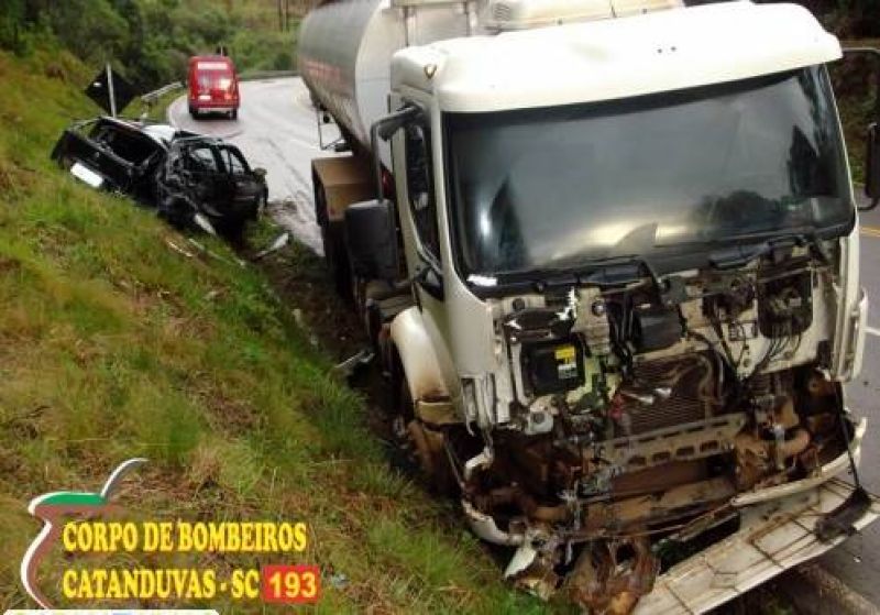 20/06/2013 Uma colisão frontal por volta das 08h30 desta quarta-feira (19) foi registrada na BR-282 em Catanduvas. O acidente aconteceu nas proximidades da ervateira Catanduvas e envolveu um caminhão Volvo VM-270 carregado de ração e um veículo Renault Megane. O motorista do carro sofreu escoriações no rosto e sentia dores na região abdominal. Ele foi atendido pelo Corpo de Bombeiros e encaminhado ao Hospital Universitário Santa Terezinha de Joaçaba. O condutor do caminhão nada sofreu.