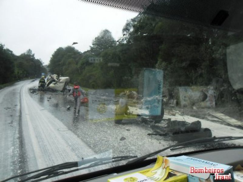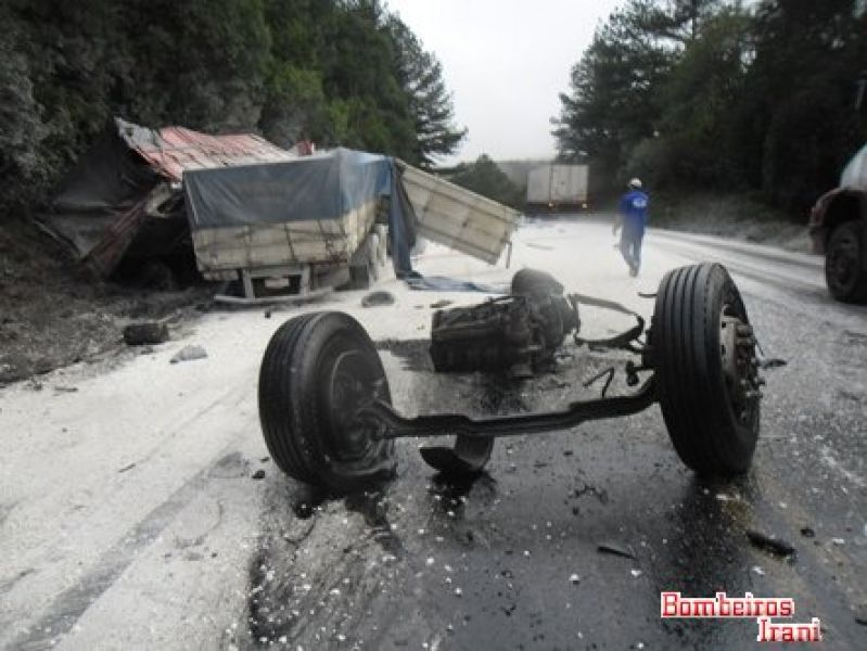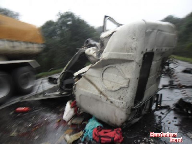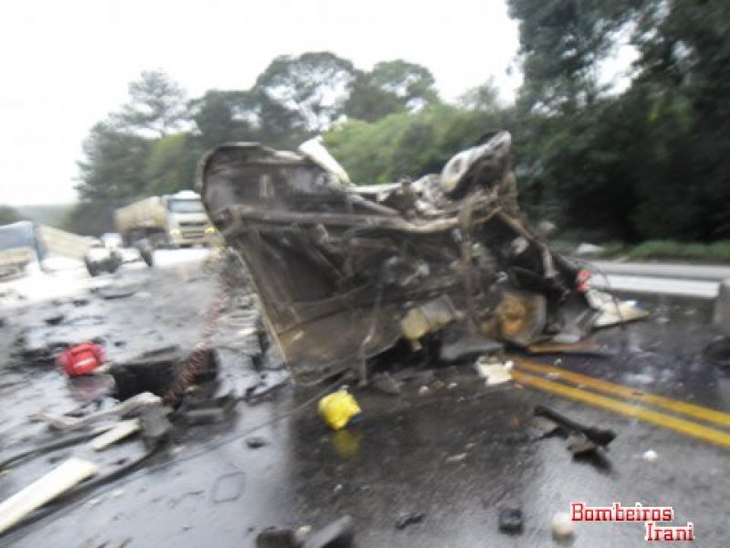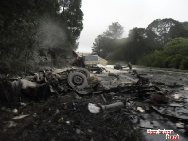 21/06/2013 Três pessoas morreram em um gravíssimo acidente na tarde desta sexta-feira (21) no km 45 da BR-153, entre Irani e Água Doce. Colisão entre duas carretas por volta das 16h mobilizou bombeiros de Irani, Catanduvas e Água Doce. O acidente aconteceu nas proximidades do acesso à empresa Celulose Irani. O trânsito ficou bloqueado nos dois sentidos. Policiais Rodoviários Federais fizeram o levantamento para apontar as causas do acidente. Os veículos ficaram completamente destruídos. As duas carretas tiveram as cabines arrancadas. Em um caminhão com placas de Caxias do Sul (RS) estavam Paulino Ientraicak, de 45 anos, e a esposa de 50 anos. Os dois estavam presos entre as ferragens e tiveram morte instantânea. No outro caminhão com placas de Pato Branco (PR) estava o motorista José Agoniesi, de 61 anos, também em óbito. Os bombeiros ressaltaram que não foi possível fazer a identificação dos caminhões devido ao estado em que ficaram. Também não foi possível apurar o sentido que os caminhões faziam. Com o impacto, uma das cabines chegou a ficar fora da pista.