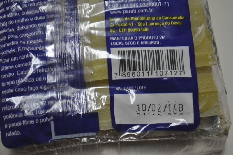 27/06/2013 “Foi um susto. Ia preparar a lasanha para o almoço da minha família, quando abri a embalagem. A massa parecia estar mofada, havia várias teias de aranha e dois pequenos insetos”, reclama a dona de casa que preferiu não ser identificada. O produto que é uma massa para lasanha, de 200 gramas, com fabricação chilena e distribuído por uma empresa de São Lourenço do Oeste, no oeste de Santa Catarina, está dentro do prazo de validade, o vencimento da embalagem registra 10/02/2014, mas não tem o lote de fabricação.