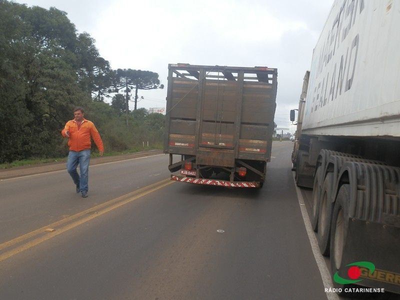 01/07/2013 Caminhoneiros do Meio-Oeste Catarinense aderiram nesta segunda-feira (01) a paralisação geral da categoria que tem por objetivo fechar rodovias em vários pontos do País. A greve é organizada pelo Movimento União Brasil Caminhoneiro (UBC). Na região de Joaçaba a manifestação está concentrada em dois pontos da BR-282 no município de Catanduvas: Em frente ao Posto Begnini na saída para Vargem Bonita e no trevo de acesso ao município de Jaborá. Os manifestantes bloquearam parcialmente a pista por volta das 16h e nenhum caminhão passava. Apenas caminhões que transportam cargas perecíveis, como aves e suínos, tiveram acesso livre. Todos os demais foram obrigados a estacionar nas margens da rodovia. Carros de passeio e ambulâncias transitaram de forma normal.