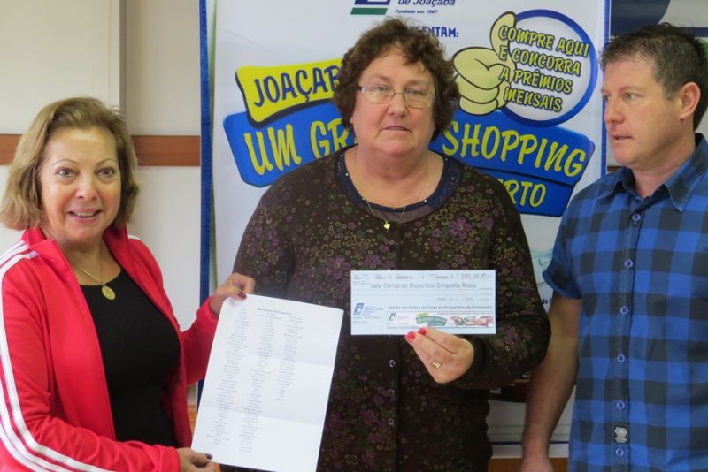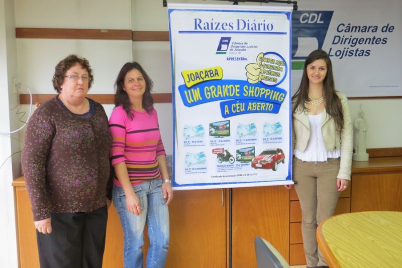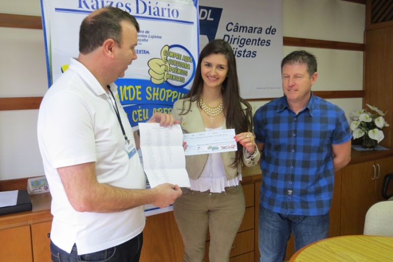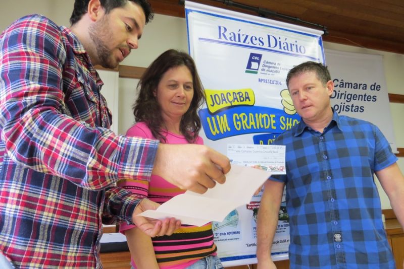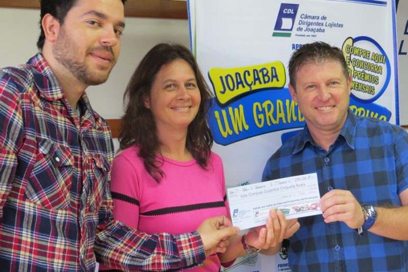 08/07/2013 A Câmara dos Dirigentes Lojistas de Joaçaba (CDL) e a empresa Raízes Diário promoveram solenidade na manhã desta segunda-feira (08) para entregar os primeiros quatro vale-compras de R$ 250,00 aos consumidores sorteados na promoção “Joaçaba Um Grande Shopping a Céu Aberto”. O sorteio aconteceu na tarde de sábado (06) na praça Adolfo Konder em frente a prefeitura. A entrega dos prêmios aconteceu na sede da CDL no edifício Erma Center. As consumidoras Márcia Franck Altmann (Pisorama), Leonidas da Silva (Dotti Esportes), Bruna Kasteller (Poco Loco) e Erica Schutz (Caitá) compraram nas lojas que aderiram a promoção e foram contempladas nesta primeira etapa da promoção. O próximo sorteio acontecerá em agosto e os consumidores estarão concorrendo a uma TV de 42 polegadas. Até de dezembro serão sorteados R$ 35 mil em prêmios, entre eles uma Moto e um Carro.