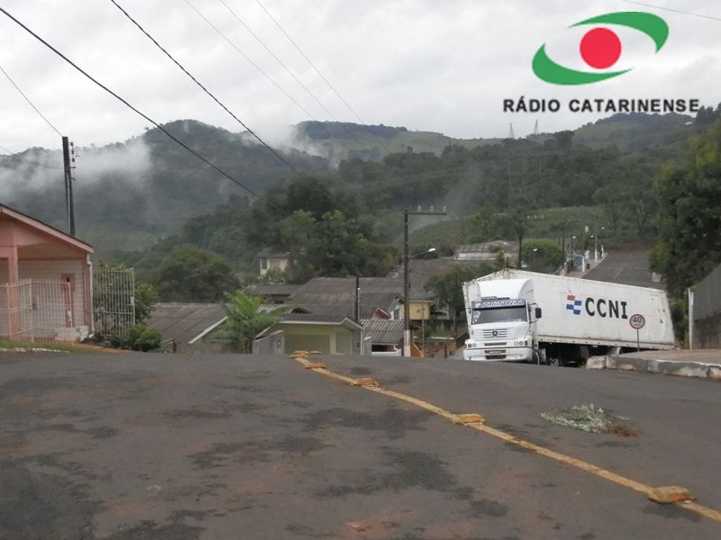 27/03/2012 A carreta que corria risco de tombar na rua Amilton Rossim, bairro Clara Adélia em Joaçaba, foi removida no início da tarde desta terça-feira (27). O motorista, que não conhecia a cidade, entrou na rua por engano na noite desta segunda-feira (26) por volta das 20hs. A carreta com placas de Palmitos (SC) não conseguiu subir um trecho da rua e começou deslizar ficando atravessada na via. Chovia na hora do incidente. O caminhão estava pendido e até escoras de madeira foram usadas na tentativa de evitar o tombamento.