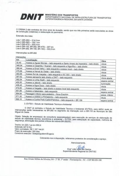 19/07/2013 O Ministério dos Transportes através do Departamento Nacional de Infraestrutura de Transportes (DNIT) firmou contrato de R$ 1.167.144,91 com a empresa Sotepa/Iguatemi/Angevix para elaboração de Estudo de Viabilidade Técnica e Ambiental (EVTA) para definir quais as intervenções serão necessárias na BR-282em Santa Catarina.Oestudo tem por finalidade apontar as necessidades de adequação, capacidade, melhoria da segurança e eliminação dos pontos críticos da rodovia. A empresa tem 300 dias para fazer o levantamento em427,8 quilômetrosde extensão. A informação foi confirmada pelo superintendente regional do DNIT em SC, engenheiro João José dos Santos. A BR-282 está incluída juntamente com a BR-280 e BR-470 no primeiro lote de obras a serem realizadas através do programa de Conservação, Manutenção e Restauração de rodovias (CREMA 2ª Etapa), cujos contratos são de cinco anos de duração. O CREMA 2ª Etapa prevê obras nas BRs 282, 470, 153, 158, 163 e 280. Na região de Joaçaba, sete pontos de melhorias foram apontados pelo DNIT em relação a interseções: