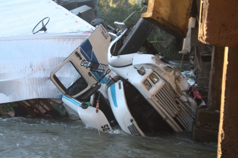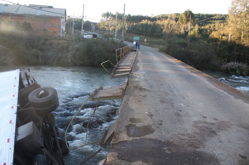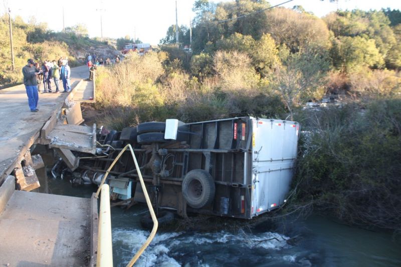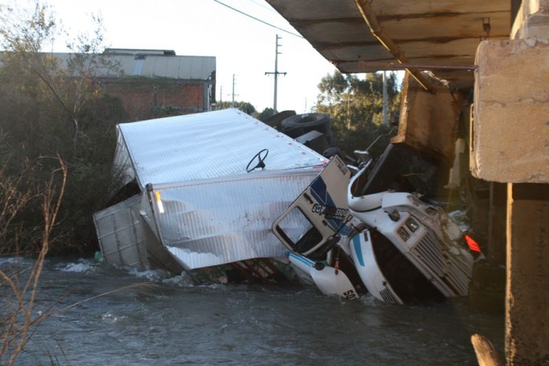 28/07/2013 Um acidente entre dois caminhões sobre uma ponte por pouco não terminou em tragédia em Campos Novos. Foi na SC-455 no trecho do Distrito de Ibicuí que liga Campos Novos ao Município de Abdon Batista. Em menos de 15 dias 3 acidentes foram registrados no local. O grande problema do trecho é que a ponte que une as duas pistas tem espaço para passar um veículo de cada vez. O trajeto é perigoso, pois, não há sinalização adequada para que os motoristas reduzam a velocidade para passar no local. Na tarde desta sexta-feira (26) por volta das 17h um caminhão Mercedes Bens (Furgão), placas IJC-1441 de Farroupilha (RS), estava transitando na SC-455 sentido Abdon Batista/Campos Novos, quando, segundo informações coletadas, apresentou problemas mecânicos e não conseguiu reduzir a velocidade ao chegar na cabeceira da ponte. Ao mesmo instante um caminhão Guincho VW, Placas MBQ 1567 de Campos Novos, estava em cima da ponte, sentido Campos Novos/Abdon Batista e por pouco a tragédia não foi ainda maior. O condutor caminhão furgão para não bater no guincho jogou seu veículo para dentro do Rio Ibicuí. Estavam no caminhão furgão o motorista, Cristiano Dornelles Xavier (33) que sofreu ferimentos leves; e o caroneiro Moisés Rodrigues (28), que sofreu escoriações pelo corpo e na cabeça. Ambos foram atendidos no Hospital Dr. José Athanásio e estão em observação. O motorista do Caminhão Guincho, Osmar Rogério De Meneck (60), nada sofreu. O acidente foi atendido pelo Corpo de Bombeiros Comunitário de Campos Novos e pela Polícia Militar. O choque do caminhão na ponte causou problemas no fornecimento de água no distrito de Ibicui e a equipe do Samae está no local para restabelecer serviço. Cabe informar que uma mobilização está agendada para o dia 30 de julho a partir das 13h no local, para solicitar uma solução urgente. Entre os pedidos estão melhor sinalização e duplicação da ponte. A mobilização está sendo organizada pelo motorista Joel Santin, que também sofreu um acidente no mesmo local no dia 14 de julho. Enquanto a equipe de reportagem estava no local por pouco outro acidente não foi flagrado. O registro mostra dois veículos de pequeno porte que se encontraram no início da ponte no mesmo local, do acidente.