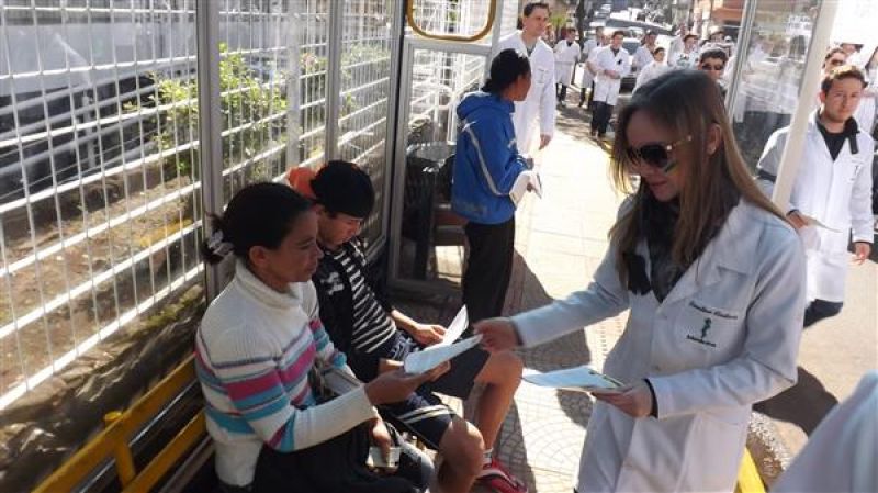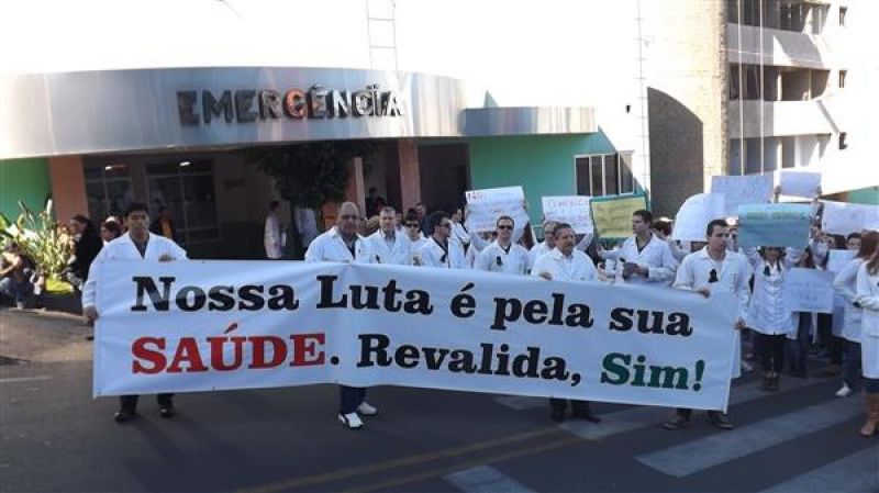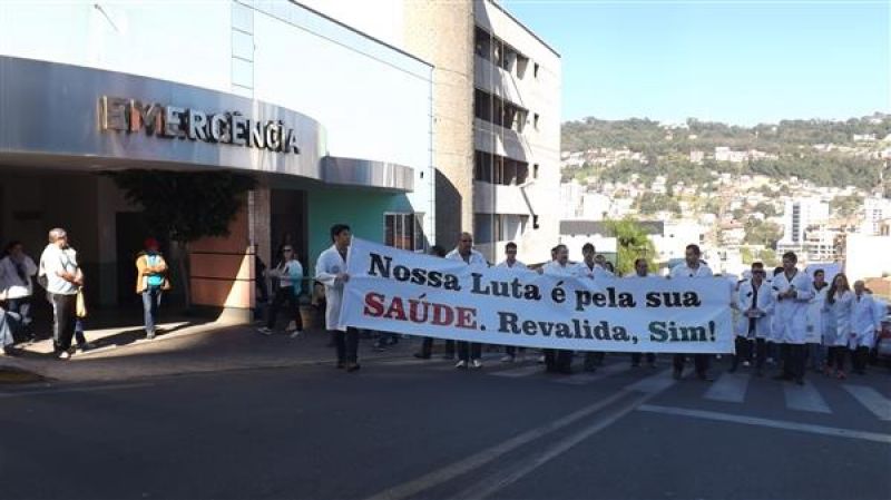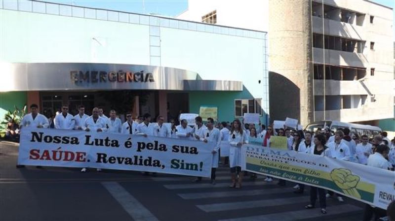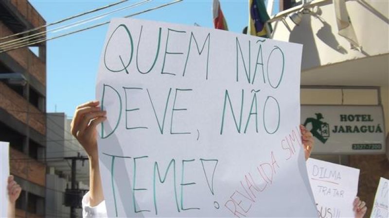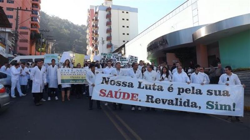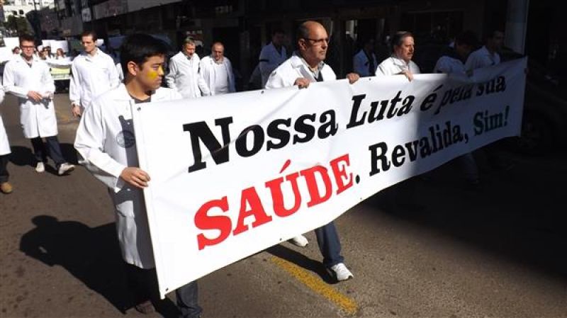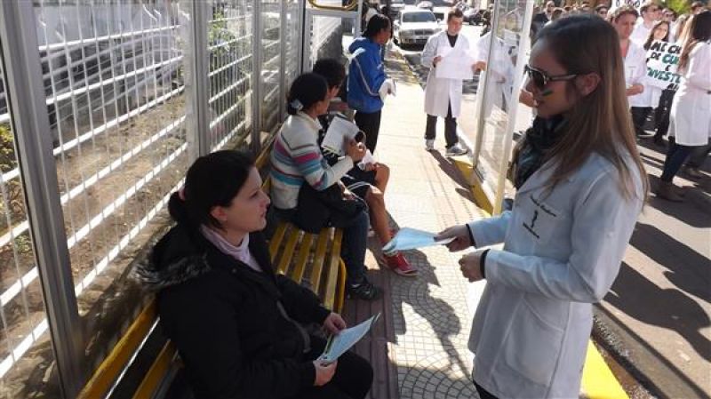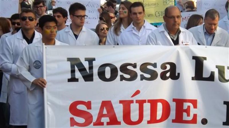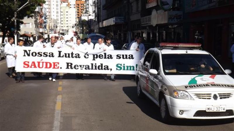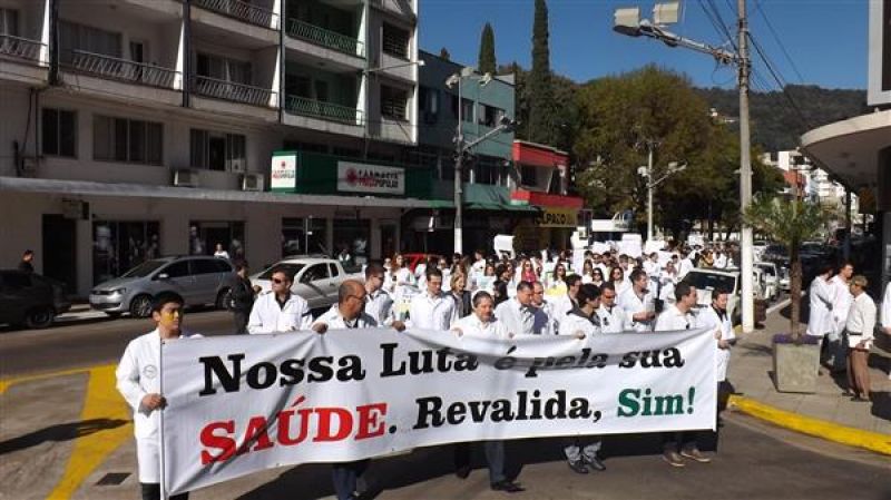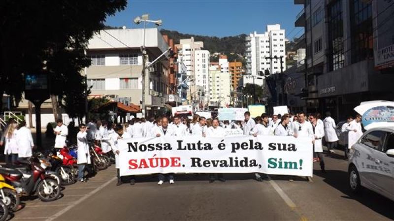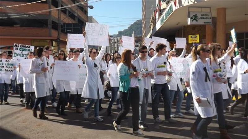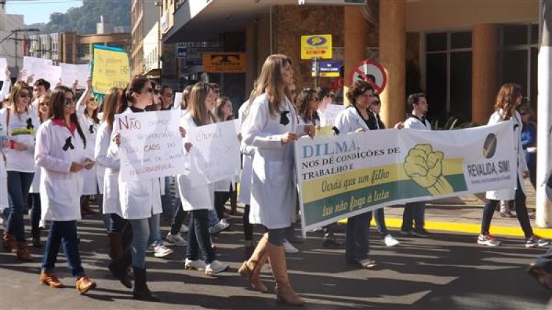 31/07/2013 Um grupo de aproximadamente 100 pessoas – formado por médicos e a maioria estudantes de Medicina da Unoesc realizou protesto na manhã desta quarta-feira (31) no centro de Joaçaba. A concentração iniciou às 9h30 na praça Adolfo Konder. Em seguida os manifestantes fizeram caminhada em direção ao Hospital Universitário Santa Terezinha (HUST). Utilizando tarjas pretas nos jalecos, durante o trajeto distribuíram cartilhas às pessoas na rua com as explicações sobre o objetivo do movimento. Posteriormente retornaram até em frente à prefeitura. O protesto engrossou a mobilização nacional da categoria que reivindica a realização do Revalida (exame que médicos formados em universidades estrangeiras prestem um novo exame provando que têm condições de exercer a medicina no novo país); contrariedade ao curso de medicina com duração de oito anos conforme proposto pelo Governo Federal (atualmente o curso é de seis anos, o mais longo existente; contrariedade à alegação do governo de que faltam médicos no Brasil (A ONU e a OMS recomendam como proporção ideal a existência de um médico para cada mil habitantes, e de acordo com a categoria, no país são dois médicos para cada mil habitantes); e críticas ao programa Mais Médicos, considerada medida eleitoreira da gestão Dilma Rousseff. O presidente do Sindicato dos Médicos de Joaçaba e Região, Paulo Albuquerque, compara a situação enfrentada pela população à respeito da saúde pública, principalmente à deficiência dos hospitais, a defasagem da tabela SUS e a falta de infraestrutura para melhor atendimento à população, com outros aspectos. “Seriam os motoristas de ônibus responsáveis pelo caos do transporte público, seriam os agricultores os responsáveis pela população que passa fome ou seriam os engenheiros responsáveis pelos sem-teto”, indaga. Para ele o governo tenta jogar a culpa nos profissionais médicos a responsabilidade que seria do Poder Público oferecer para beneficiar diretamente a população. O protesto em Joaçaba teve apoio do Sindicato dos Médicos do Estado de Santa Catarina (SIMESC) e do Conselho Superior de Entidades Médicas de Santa Catarina (COSEMESC). A presidente do Centro Acadêmico de Medicina da Unoesc Joaçaba, Ana Eduviges, afirma que a “solução” encontrada pelo governo para tentar amenizar os problemas da saúde pública são apenas falácias, sem caráter eficaz. Para ela, os estudantes passam por seis anos de universidade. Posteriormente muitos partem para a especialização, o que pode levar em média, somando todos os anos de estudo, de 11 a 15 anos em bancos universitários. “Agora o governo quer ampliar para mais dois anos o curso de Medicina. Como ficam os pais que bancam a faculdade dos filhos, nós próprios que passamos um longo tempo estudando para se formar”, questiona. Ela completa que durante a formação o acadêmico já realiza estágio com prestação de atendimento à população carente, e que os dois anos que o governo quer inserir na grade curricular não acrescentam para o profissional. O movimento teve a participação do membro do Conselho Federal de Medicina, Élcio Luiz Bonamigo, um dos profissinais mais conceituados no país e que fez questão de prestar apoio e solidariedade aos colegas. Os médicos que participaram do protesto suspenderam as atividades somente pela parte da manhã, sendo o atendimento retomado normalmente a partir da tarde.