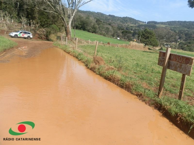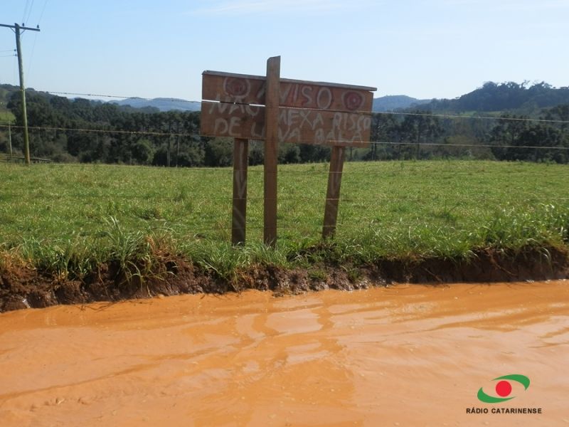 07/08/2013 Enquanto muitos agricultores cobram manutenção de estradas, em uma comunidade no interior de Joaçaba a polêmica foi instalada após a fixação de uma placa que faz um alerta: “Aviso: Não mexa, risco de levar bala”. Na manhã desta quarta-feira (07) a Central de Jornalismo da Rádio Catarinense recebeu a informação de um motorista que transitava em linha Ficanha quando se deparou com a placa às margens da estrada geral, transformada em um verdadeiro lago devido ao acúmulo de água da chuva que não tem para onde escoar. Escoltados pela Polícia Militar, os profissionais foram até a comunidade. Cerca de cinquenta metros antes de chegar no centro comunitário de Linha Ficanha constatamos a existência da placa de madeira estaqueada na divisa de uma propriedade com os dizeres na cor branca contornadas em vermelho. Em contato com alguns moradores, a reportagem foi informada que o proprietário da terra – que não será identificado - impede que a água seja desviada para não invadir sua lavoura. O volume de água foi tanto que na madrugada desta terça-feira o trânsito teve que ser interrompido no local. A polêmica causa receio entre os moradores da linha Ficanha que preferem não se manifestar para evitar animosidade. No local ficou evidente a necessidade de um sistema de drenagem eficaz que não venha a prejudicar o produtor, e muito menos moradores e pessoas que passam pela estrada geral.
