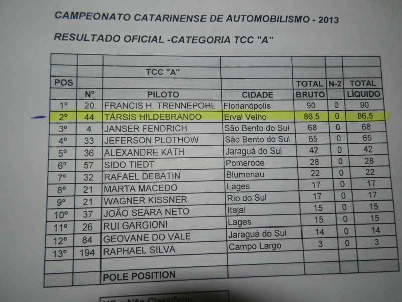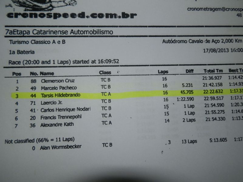 Já na Categoria Turismo Clássico Catarinense, o piloto joaçabense Társis Hildebrando que ficou em 3º no Treino Classificatório e está em 2º Lugar no Campeonato, terminou a 1º Bateria em 1º Lugar com 1:17.311. Neste domingo acontece a 2º Bateria.