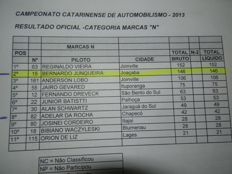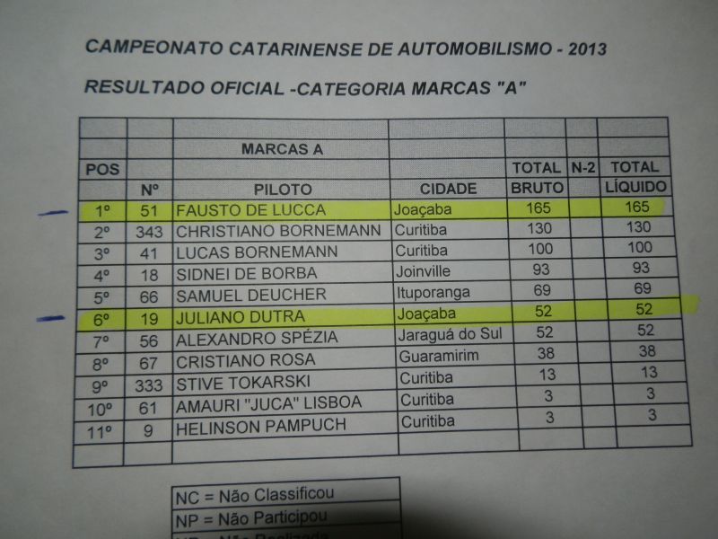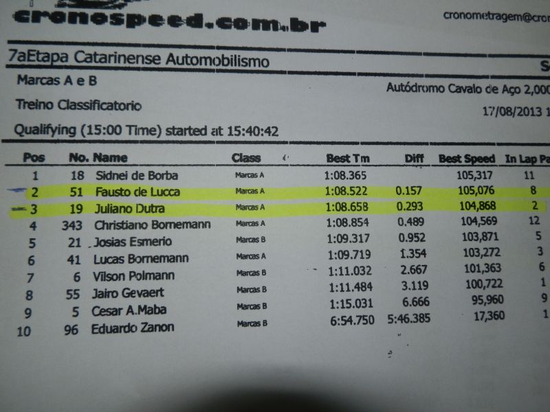 Na categoria Marcas "A" e "B" onde tem dois pilotos Joaçabenses teve um treino classificatório muito disputado. Fausto de Lucca que lidera o Campeonato terminou em 2º lugar com tempo de 1:08.522. O também Joaçabense Juliano Dutra, que está em 6º no Campeonato, chegou em 3º lugar no treino classificatório com tempo de 1:08.658.