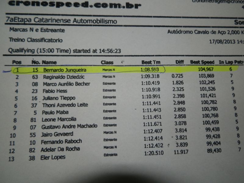 17/08/2013 Foram realizados neste sábado (17) os treinos livres e classificatórios em todas as categorias, e a 1ª Bateria Turismo Clássico "A" e "B". Nos treinos classificatórios destaque para o piloto Joaçabense Bernardo Junqueira que corre nas Marcas "N" garantiu a pole positions. Bernardo que está em 2º lugar no campeonato fechou o treino classificatório em 1:08.539.