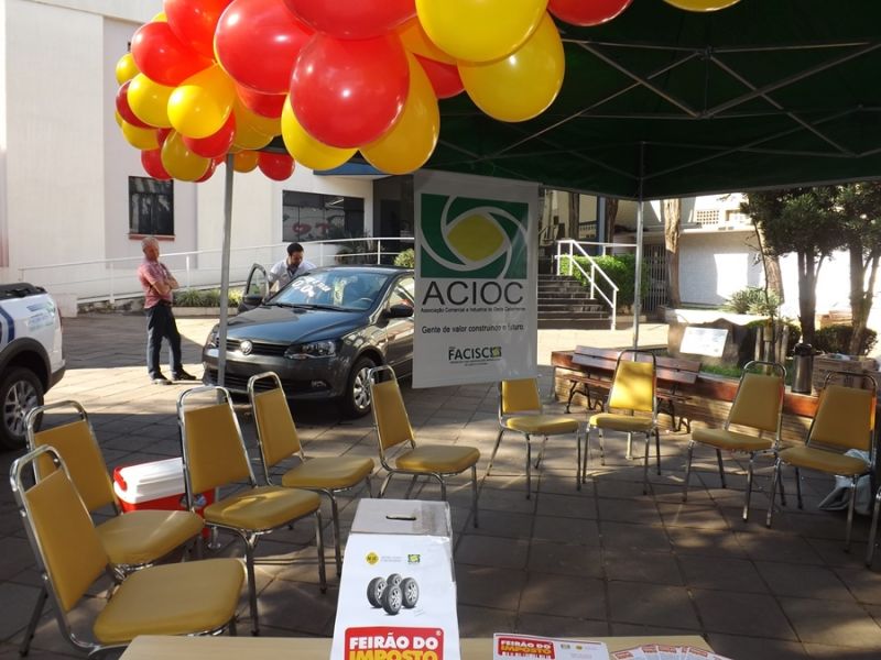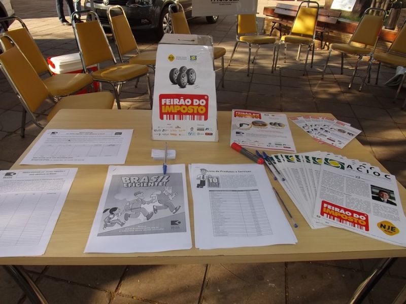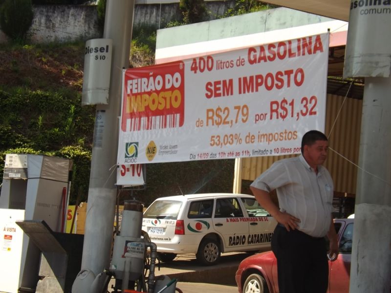 14/09/2013 Para conscientizar a população da elevada carga tributária que os cidadãos pagam no País, o Núcleo Jovem Empreendedor da Associação Comercial e Industrial do Oeste Catarinense (ACIOC) em parceria com empresas do município, promoveu neste sábado (15) em Joaçaba o Feirão do Imposto. Trata-se de ação de nível nacional que visa a conscientização sobre as taxas de impostos que incidem sobre os produtos que o consumidor paga. O Feirão do Imposto foi realizado na praça Adolfo Konder. Foram disponibilizados para a população o direito de compra de alguns itens sem imposto, que são um jogo de pneus, 800 litros de combustível e hospedagem em hotel de Piratuba. Os produtos foram comercializados através de um sorteio que deu preferência da compra. O litro da gasolina, por exemplo, foi vendido a R$ 1,32 em dois postos que aderiram ao movimento.