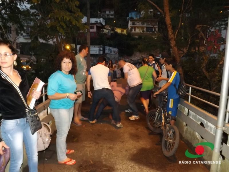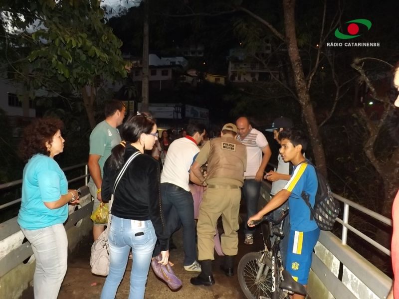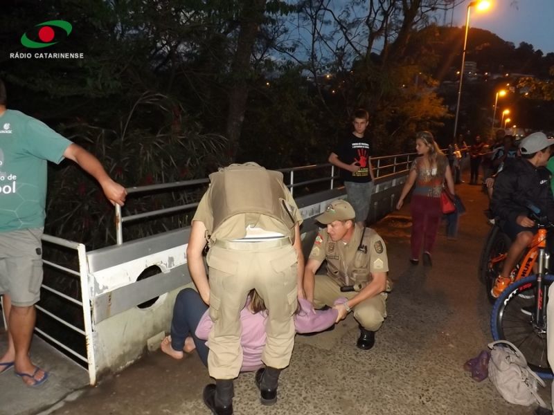 18/10/2013 Pedestres que passavam na passarela Atílio Pagnoncelli na noite desta quinta-feira (17) evitaram que uma mulher se jogasse no Rio do Peixe. O fato ocorreu por volta das 19h, horário de grande circulação de pessoas, principalmente trabalhadores, que fazem o percurso para se deslocar entre Joaçaba e Herval d' Oeste. Uma mulher, visivelmente alterada psicologicamente, foi contida por populares no momento em que tentava se atirar da passarela. Um vídeo obtido pela Rádio Catarinense mostra o momento em que um homem agarra a mulher que já estava no parapeito da passarela. Ela relutava fazendo com que o homem utilizasse de muita força para dominá-la. As imagens mostram que se não fosse a intervenção dos populares a mulher cairia no rio. Segundo relatos a mulher gritava a todo o momento para que a soltassem. A Polícia Militar foi acionada e conseguiu controlar a situação. Ela foi conduzida ao Hospital Universitário Santa Terezinha de Joaçaba para avaliação médica.